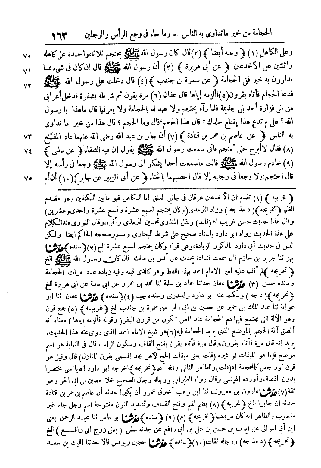 وعلى الكاهل (1) (وعنه أيضاً) (2) قال كان رسول الله صلى الله عليه وسلم يحتجم ثلاثاً، واحدة على كاهله واثنتين على الأخدعين (عن أبى هريرة) (3) أن رسول الله صلى الله عليه وسلم قال إن كان في شئ مما تداوون به خير ففى الحجامة (عن سمرة بن جندب) (4) قال دخلت على رسول الله صلى الله عليه وسلم فدعا الحجام فأتاه بقرون (5) فألزمه إياها قال عفان (6) مرة بقرن ثم شرطه بشفرة فدخل أعرابى من بنى فزارة أحد بنى جذيمة فلما رآه يحتجم ولا عهد له بالحجامة ولا يعرفها قال ما هذا يا رسول الله؟ على م تدع هذا يقطع جلدك؟ قال هذا الحجم، قال وما الحجم؟ قال هذا من خير ما تداوى به الناس (عن عاصم بن عمر بن قتادة) (7) أن جابر بن عبد الله رضى الله عنهما عاد المقَّنع (8) فقال لا أبرح حتى تحتجم فإنى سمعت رسول الله صلى الله عليه وسلم يقول إن فيه الشفاء (عن سلمى) (9) خادم رسول الله صلى الله عليه وسلم قالت ما سمعت أحداً يشكو إلى رسول الله صلى الله عليه وسلم وجعاً في رأسه إلا قال احتجم: ولا وجعاً في رجليه إلا قال احصبهما بالحناء (عن أبى الزبير عن جابر) (10) أن أم