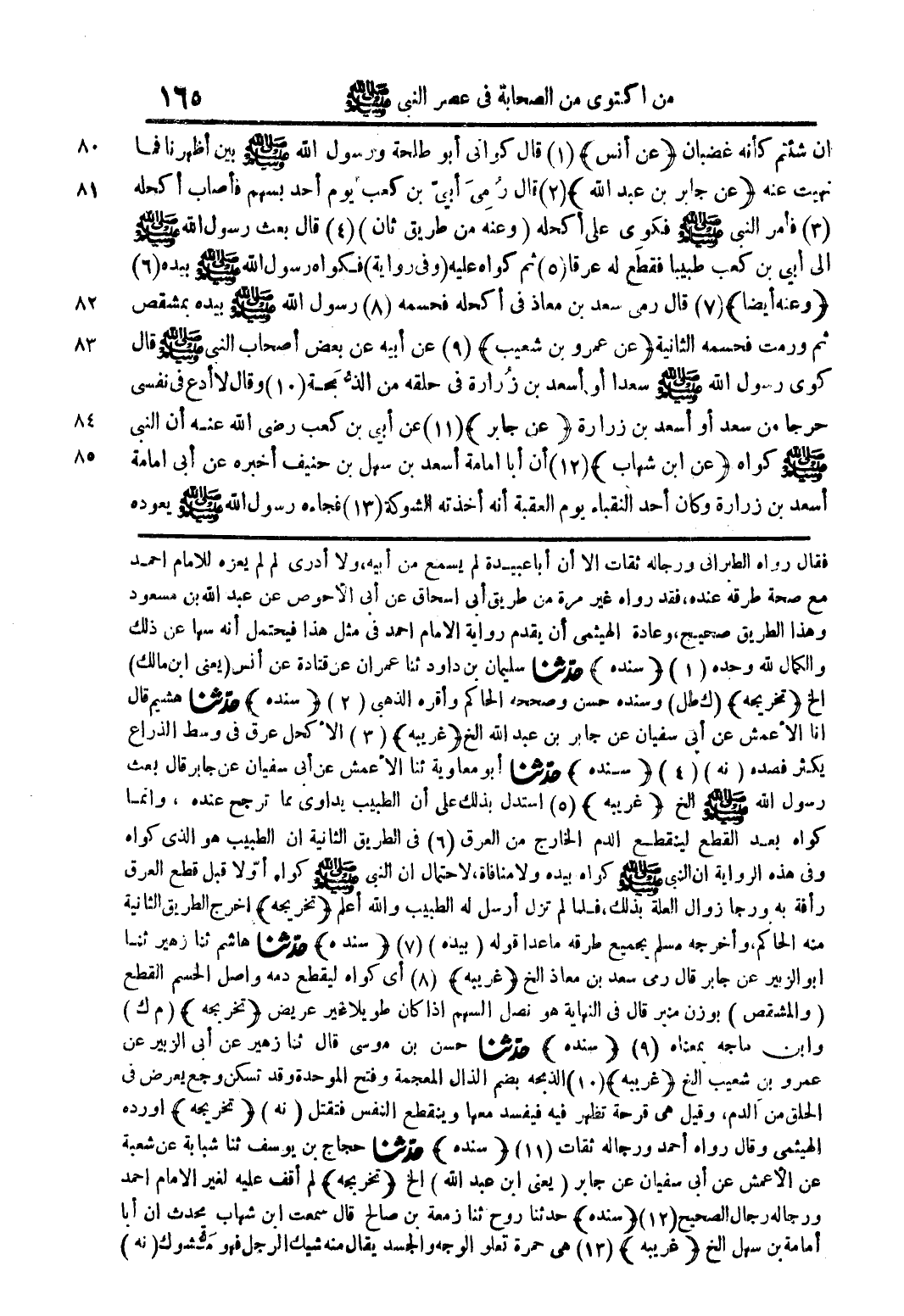 إن شئتم كأنه غضبان (عن أنس) (1) قال كوانى أبو طلحة ورسول الله صلى الله عليه وسلم بين أظهرنا فما نهيت عنه (عن جابر بن عبد الله) (2) قال رمى أبيّ بن كعب يوم أحد بسهم فأصاب أكحله (3) فأمر النبى صلى الله عليه وسلم فكوى على أكحله (وعنه من طريق ثان) (4) قال بعث رسول الله صلى الله عليه وسلم إلى أبي بن كعب طبيباً فقطع له عرقاً (5) ثم كواه عليه (وفى رواية) فكواه رسول الله صلى الله عليه وسلم بيده (6) (وعنه أيضاً) (7) قال رمى سعد بن معاذ في أكحله فحسمه (8) رسول الله صلى الله عليه وسلم بيده بمشقص ثم ورمت فحسمه الثانية (عن عمرو بن شعيب) (9) عن أبيه عن بعض أصحاب النبى صلى الله عليه وسلم قال كوى رسول الله صلى الله عليه وسلم سعداً أو أسعد بن زرارة فى حلقه من الذُّبحة (10) وقال لا أدع في نفسى حرجاً من سعد أو أسعد بن زرارة (عن جابر) (11) عن أبي بن كعب رضى الله عنه أن النبى صلى الله عليه وسلم كواه (عن ابن شهاب) (12) أن أبا أمامة أسعد بن سهل بن حنيف أخبره عن أبى أمامة أسعد بن زرارة وكان أحد النقباء يوم العقبة أنه أخذته الشوكة (13) فجاءه رسول الله صلى الله عليه وسلم يعوده