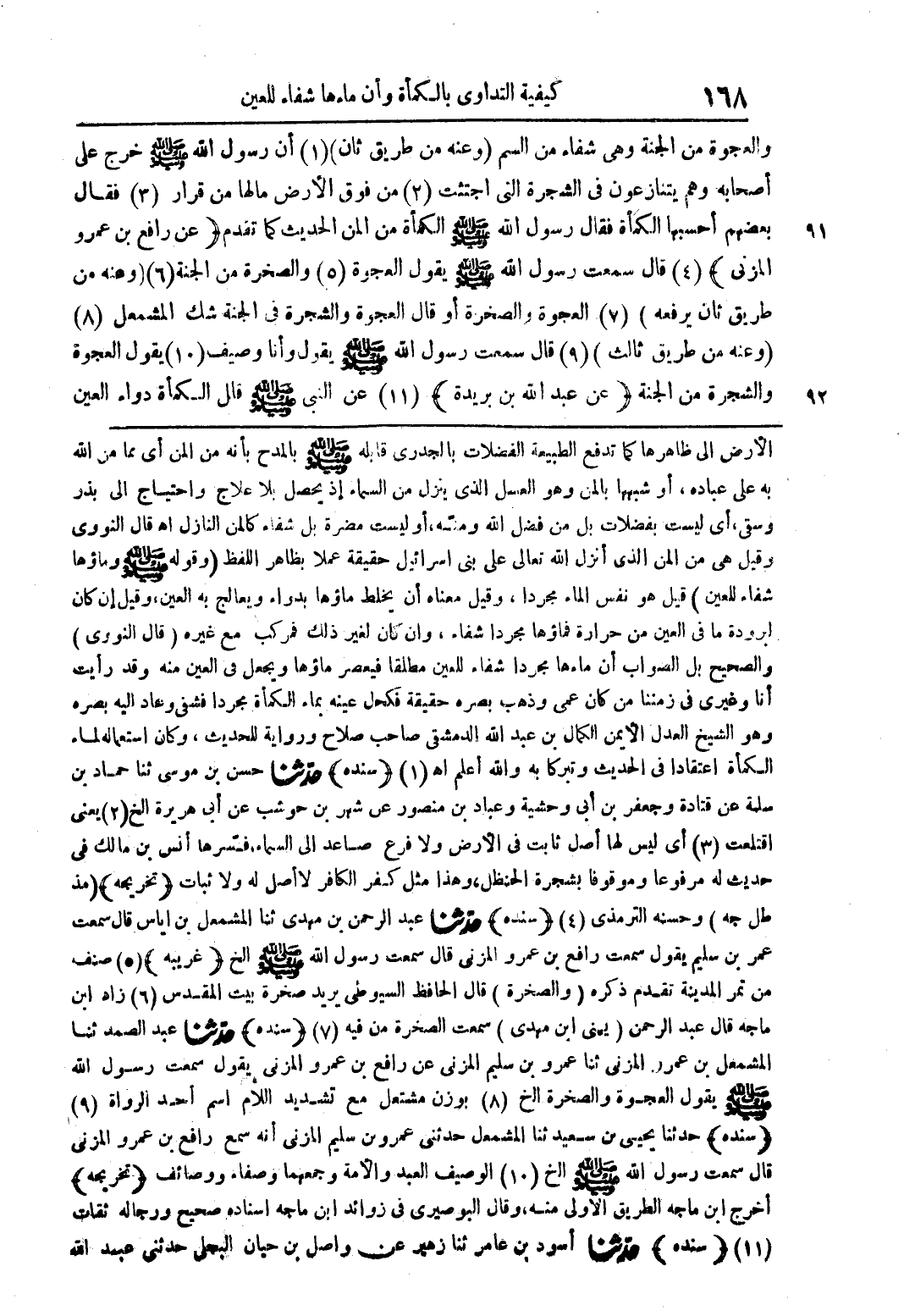 الأرض إلى ظاهرها كما تدفع الطبيعة الفضلات بالجدرى قابلة صلى اللة علية وسلم بالمدح بانة من المن اى مما من اللة بة على عبادة او شبهها بالمن وهو العسل الذى ينزل من السماء اذا يحصل بلا علاج واحتياج الى بذر وسقى اى ليست بفضلات بل من فضل اللة ومنة او ليست مضرة بل شفاء كامن اه قال النووى وقيل هى من المن الذى انزل اللة تعالى على بنى اسرائيل حقيقة عملا يظاهر اللفظ (وقولة صلى اللة علية وسلم وماؤها شفاء للعين) قيل هو نفس الماء مجردا وقيل معناه ان يخلط ماؤها بدواء ويعالج بة العين وقيل ان كان ابرودة ما فى العين من حرارة فماؤها مجردا شفاء وان كان لغير ذلك فمركب مع غيرة (قال النووى) والصحيح با الصواب ان ماءها مجردا شفاء للعين مطلقا فيعصر ماؤها ويجعل فى العين منة وقد رايت انا وغيرى فى زمننا من كان عمى وذهب بصرة حقيقة فكحل عينة بماء الكمأه مجردا فشفى وعاد الية بصرة وهو الشخ العدل الايمن الكمال بن عبد اللة الدمشقى صاحب صلاح ورواية للحديث وكان استعمالة لماء الكمأه اعتقادا فى الحديث وتبركا بة والةل اعلم اه (1) (سندة) حدثنا حسن بن موسى ثنا حماد بن سلمة عن قتادة بن ابى جعفر بن ابى وحشية وعباد بن منصور عن شهر بن حوشب عن ابى هريرة الخ (2) يعنى اقتلعت (3) اى ليس لها اصل ثابت فى الارض ولا فرع صاعد الى السماء فسرها انس بن مالك فى حديث لة مرفوعا وموقوفا بشجرة الحنظل وهذا مثل كفر الكافر لا اصل لة ولا ثبات (تريجة) (مذ طل جة) وحسنة الترمذى (4) (سندة) حدثنا عبد الرحمن بن مهدى ثنا المشمعل بن اياس قال سمعت عمر بن سليم يقول سمعت رافع بن عمرو المزنى قال سمعت رسول اللة صلى اللة علية وسلم الخ (غريبة) (5) صنف من تمر المدينة تقدم ذكرة (والصرة) قال الحافظ السيوطى يريد صخرة بيت المقدس (6) زاهر ابن ماجة قال عبد الرحمن (يعنى ابن المهدى) سمعت صخرة من فية (7) (سندة) حدثنا عبد الصمد ثنا المشمعل بن عمرو المزنى ثنا عمرو بن سليم المزنى عن رافع بن عمرو المزنى يقول سمعت رسول اللة صلى اللة علية وسلم سقول العجوة والصرة الخ (8) بوزن مشتعل مع تشديد الللام اسم احد الرواه (9) (سندة) حدثنا يحيى بن سعيدثنا المشعمل حدثنى عمرو بن سليم المزنى انة سمع رافع بن عمرو المزنى قال سمعت رسول اللة صلى اللة علية وسلم الخ (10) الوصيف العبد والامة وجمعهما وصفاء ووصائف (تخريجة) اخرج ابن ماجة الطريق الاولى منة وقال البوصيرى فى زوائد ابن ماجة اسناة صحيح ورجالة ثقات (11) (سندة) حدثنا اسود بن عامر ثنا زهير عن واصل بن حيان البحلى حدثني عبد الله