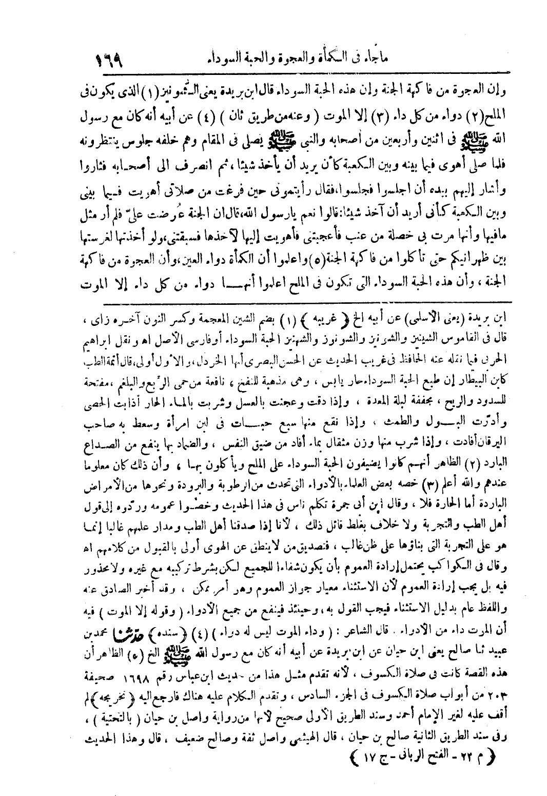 وإن العجوة من فاكهة الجنة وإن هذه الحبة السوداء قال ابن بريدة يعنى الشونيز (1) الذي يكون في الملح (2) دواء من كل داء (3) إلا الموت (وعنه من طريق ثان) (4) عن أبيه أنه كان مع رسول الله صلى الله عليه وسلم في اثنتين وأربعين من أصحابه والنبى صلى الله عليه وسلم يصلى في المقام وهم خلفه جلوس ينتظرونه فلما صلى أهوى فيما بينه وبين الكعبة كأن يريد أن يأخذ شيئاً، ثم انصرف إلى أصحابه فثاروا وأشار إليهم بيده أن أجلسوا فجلسوا، فقال رايتمونى حين فرغت من صلاتى أهويت فيما بينى وبين الكعبة كأنى أريد أن آخذ شيئاً: قالوا نعم يا رسول الله، قال إن الجنة عرضت علىّ فلم أر مثل ما فيها وأنها مرت بى خصلة من عنب فأعجبتنى فأهويت إليها لآخذها فسبقتنى، ولو أخذتها لغرستها بين ظهرانيكم حتى تأكلوا من فاكهة الجنة (5) وأعلموا أن الكمأة دواء للعين، وأن العجوة من فاكهة الجنة، وأن هذه الحبة السوداء التي تكون في الملح اعلموا أنها دواء من كل داء إلا الموت