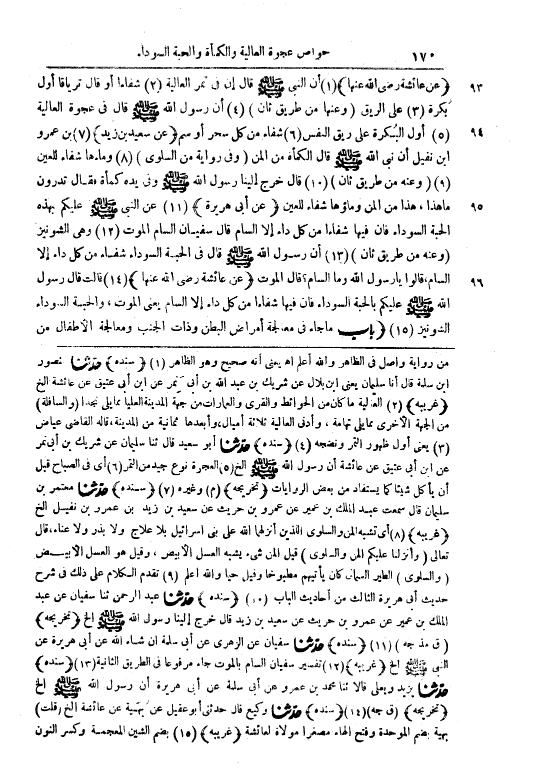 (عن عائشة رضى الله عنها) (1) أن النبى صلى الله عليه وسلم قال إن في تمر العالية (2) شفاءاً أو قال ترياقاً أول بكرة (3) على الريق (وعنها من طريق ثان) (4) أن رسول الله صلى الله عليه وسلم قال في عجوة العالية (5) أول البُكرة على ريق النفس (6) شفاء من كل سحر أو سم (عن سعيد بن زيد) (7) بن عمرو ابن نفيل أن نبى الله صلى الله عليه وسلم قال الكمأة من المن (وفى رواية من السلوى) (8) وماءها شفاء للعين (9) (وعنه من طريق ثان) (10) قال خرج إلينا رسول الله صلى الله عليه وسلم وفى يده كمأة فقال تدرون ما هذا، هذا من المن وماؤها شفاء للعين (عن أبى هريرة) (11) عن النبى صلى الله عليه وسلم عليكم بهذه الحبة السوداء فإن فيها شفاءاً من كل داء إلا السام قال سفيان السام الموت (12) وهى الشونيز (وعنه من طريق ثان) (13) أن رسول الله صلى الله عليه وسلم قال في الحبة السوداء شفاء من كل داء إلا السام، قالوا يا رسول الله وما السام؟ قال الموت (عن عائشة رضى الله عنها) (14) قالت قال رسول الله صلى الله عليه وسلم عليكم بالحبة السوداء فإن فيها شفاءاً من كل داء إلا السام يعنى الموت، والحبة السوداء الشونيز (15) (باب ما جاء في معالجة أمراض البطن وذات الجنب ومعالجة الأطفال من