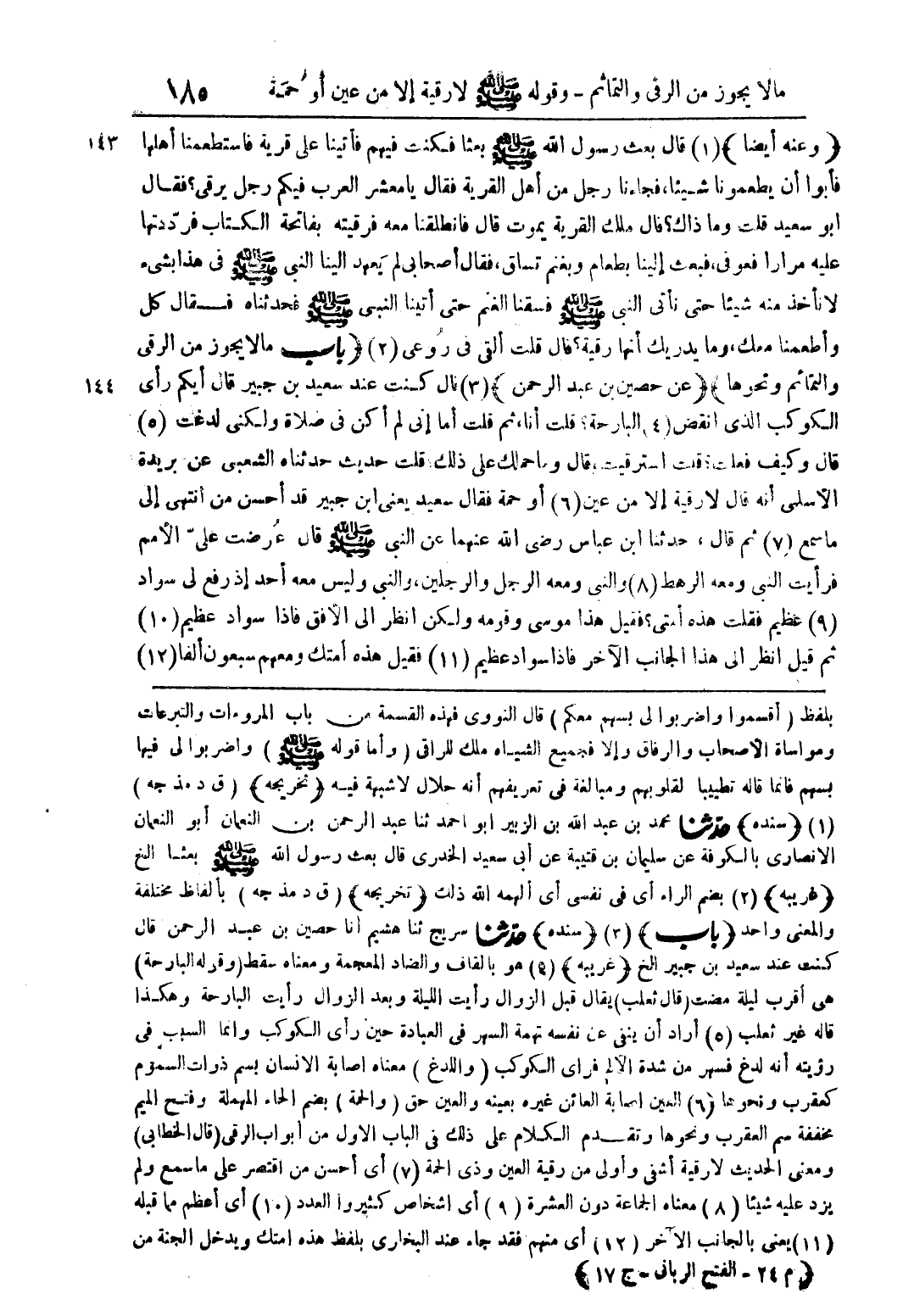 بلفظ (اقسموا) واضربوا لى بسهم معكم) قال النووى فهذة القسمة من باب المرواءت والتبرعات ومواساه الاحاب والرفاق والا فجميع الشياه ملك للراقى (واما قولة صلى اللة علية وسلم) واضربوا لة فيها بسهم فانما قالة تطيبا لقلوبهم ومبالغة فى تعريفهم انة حلال لا شبهة فية (تخريجة) (ق د مذ جة) (1) (سندة) حدثنا محمد بن عبد اللة بن الزبير ابو احمد ثنا عبد الرحمن بن النعمان ابو النعمان الانصارى بالكرفة عن سليمان بن قتيبة عن ابى سعيد الخدرى قال بعث رسول اللة صلى اللة علية وسلم بعثا الخ (غريبة) (2) بضم الراء اى فى نفس اى الهم اللة ذلت (تخريجة) (ق د مذ جة) بالفاظ متلفة والمعنى واحد (باب) (2) (سندة) حدثنا سريج ثنا هشيم انا حصين بن عبد الرحمن قال كنت عند سعيد بن جبير ال (غريبة) (4) هو بالقاف والضاد المعجمة ومعناه سقط (وقولة البارحة) هى اقرب ليلة مضت (قال ثعلب) يقال قبل الزوال رايت الليلة وبعد الزوال رايت البارحة وهكذا قالة غير ثعلب (5) اراد ان ينفى عن نفسىة تهمة السهر فى العبادة حتى راى الكوكب وانما السبب فى رويتة انة لدغ فسهر من شدة الالم فراى الكوكب (واللدغ) معناه اصابة الانسان بسم دوات السموم كعقرب ونحوها (6) العين اصابة العائن بعينة والعين حق (والحمة) بضم الحاء المهملة وفتح الميم مففة سم العقرب ونحوها وتقدم الكلام على ذلك فى الباب الاول من ابواب الرقى (قال الخطابى) ومعنى الحديث لارقية اشفى واولى من رقية العين وذى الحمة (7) اى احسن من اقتصر على ما سمع ولم يزد علية شيئا (8) معناه الجماعة دون العشره (9) اى اشخاص كثيروا العدد (10) اى اعظم مما قبلة (11) يعنى بالجانب الاخر (12) اى منهم فقد جاء عند البخارى بلفظ هذة امتك ويدخل الجنة من