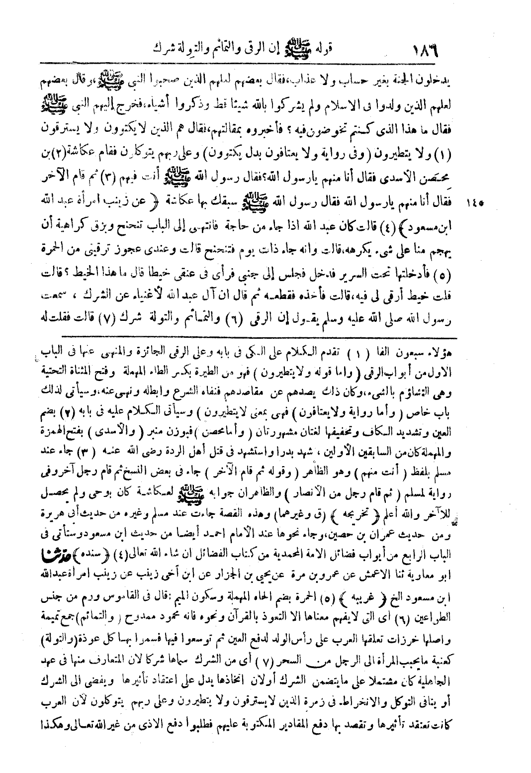 هولاء سبعون الفا (1) تقدم الكلام على الكى فى بابة وعلى الرقى الجائزة والمنهى عنها فى الباب الاول من ابواب الرقى (واما قولة ولا يتطيرون) فهو من الطيرة بكسر الطاء المهملة وفتح المثناه التحتية وهى التشاؤم بالشى وكان ذاك يصدهم عن مقاصدهم فنفاه الشرع وابطله ونهى عنة وسياتى لذلك باب اص (واما رواي ولا يعتافون) فهى بمعنى لا يتطيرون) وسياتى الكلام علية فى بابة (2) بضم العين وتشديد الكاف وتفيفها لغتان مشهورتان (واما محصن) فبوزن منبر (والاسدى) بفتح الهمزة والمهملة كان من السابقين الاولين شهد بدرا واستشهد فى قتل اهل الردة رضى اللة عنة (3) جاء عند مسلم بلفظ (انت منهم) وهو الظاهر (وقولة ثم قام الاخر) جاء فى بعض النس ثم قام رجل اخر وفى رواية لمسلم (ثم قام رجل من الانصار) والظاهر ان جوابة صلى اللة علية وسلم لعاكشة كان بوحى ولم يحصل للاخر واللة اعلم (تخريجة) (ق وغيرهم) وهذه القصة جاءت عند مسلم وغيرة من حديث ابى هريرة ومن حديث عمران بن حصين وجاء نحوها عند الامام احمد ايضا من حديث ابن مسعود وستاتى فى الباب الرابع من ابواب فضائل الامة المحمدية من كتاب الفضائل ان شاء اللة تعالى (4) (سندة) حدثنا ابو معاوية ثنا الاعمش عن عمرو بن مرة عن يحيى بن الجزار عن ابن اى زينب امراه عبد اللة ابن مسعود ال (غريبة) (5) الحمرة بضم الحاء المهملة وسكون الميم: قال فى القاموس ورم من جنس الطراعين (6) اى التى لا يفهم معناه الا التعوذ بالقران ونحوة فانة محمود (والتمائم) جمع تميمة) واصلها رزات تعلقها العرب على راس الولد لدفع العين ثم توسعلوا فيها فسموا بها كل عوذة (والتولة) كعنبة ما يحبب المراه الرجل من السحر (7) اى من شرك سماها شركا لان المتعارف منها فى عهد الجاهلية كان مشتملا على ما يتضمن الشرك اولان اتاذها يدل على اعتقاد تاثيرها ويفضى الى الشرك اة يتافى التوكل والانراط فى زمرة الذين لا يسترقون ولا يتطيرون وعلى ربهم يتوكلون لان العرب كانت تعتقد تاثيرها وتقصد بها دفع المقادير الكتوبة عليهم فطلبوا دفع الاذى من غير الله تعالى وهكذا