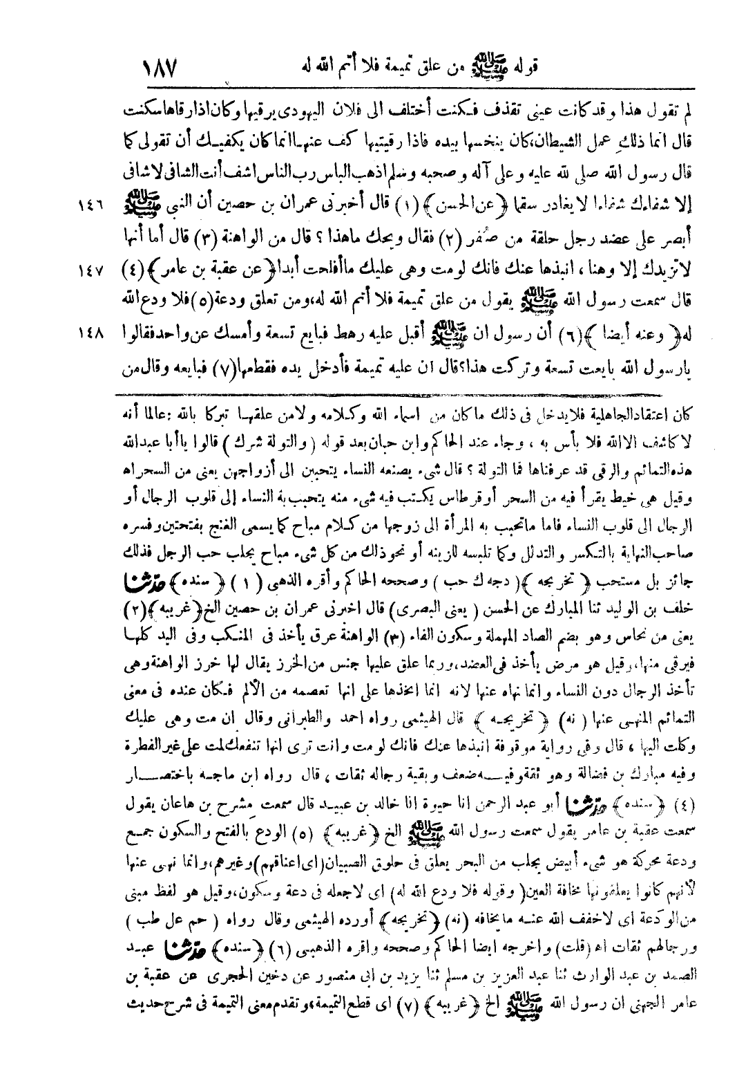 كان اعتقاد الجاهلية فلا يدخل فى ذلك ماكان من اسماء اللة وكلامة ولامن علقها تبركا باللة: عالما انة لا كاشف الا اللة فلا باس بة وجاء عند الحاكم وابن حبان بعد قولة (والتولة شرك) قالوا يا ابا عبد اللة هذة التمائم والرقى قد عرفناها فما التولة؟ قال شئ يصنعة النساء يتببن الى ازواجهن يعنى من السحر اه وقيل هى خيط يقرا فية من السحر اون قرطاس يكتب فية شئ منة يتجبب بة النساء الى قلوب الرجال او الرجال الى قلوب النساء فاما ما تجبب بة المرأة الى زوجها من كلام مباح كما يسمى الفنج بفتحتين وفسرة صاحب النهاية بالتكسر والتدلل وكما تلبسة للزينة او نحو ذلك من كل شئ مباح يجلب حب الرجل فذلك جائز بل مستحب (تخريجة) (دجة ك حب) وصححة الحاكم واقره الذهبى (1) (سندة) حدثنا لف بن الوليد ثنا المباركعن الحسن (يعنى البصرى) قال اخبرنى عمران بن حصين الخ (غريبة) (2) يعنى من نحاس وهو بضم الصاد المهملة وسكون الفاء (3) الواهنة عرق ياخذ فى فى المنكب وفى اليد كلها فيرقى منها وقيل هو مرض ياخذ فى العضد وربما علق عليها جنس من الخرز يقال لها خرز الواهنة وهى تاخذ الرجال دون النساء وانما نهاه عنها لانة انما اتذها تعصمة من الالم فكان عندة فى معنى التمائم المنهى عنها (نة) (تخريجة) قال الهيثمى رواه احمد والطبرانى وقال ان مت وهى عليك وكلت اليها قال وقى رواية موقوفة انبذها عنك فانك لو مت وانت ترى انها تنفعك لمت على غير الفطرة وفية مبارك بن فضالة وهو ثقة وفية ضعف وبقية رجالة ثقات قال رواه ابن ماجة باتصار (4) (سندة) حدثنا ابو عبد الرحمن انا حيوة انا الد بن عبيد قال سمعت مشرح بن هاعان يقول سمعت عقبة بن عامر يقول سمعت رسول اللة صلة اللة علية وسلم ال (غريبة) (5) الودع بالفتح والسكون جمع ودعة محركة هو شئ ابيض مجلب من البحر يعلق فى حلوق الصبيان (اى اعناقهم) وغيرهم وانما نهى عنها لانهم كانوا يعلفونها مخافة العين (وقولة فلا ودع اللة لة) اى لاجعلة فى دعة وسكون وقيل هو لفظ مبنى من الودعة اى لاخفف اللة عنة ما يخافة (نة) (تخريجة) اوردة الهيثمى وقال رواه (حم عل طب) ورجاله ثقات اه (قلت) واخرجة ايضا الحاكم وصححة واقرة الذهبى (6) (سندة) حدثنا عبد الصمد بن عبد الوارث ثنا عبد العزيز بن مسلم ثنا يزيد بن ابى منصور عن دخين الحجرى عن عقبة بن عامر الجهنى ان رسول اللة صلى اللة علية وسلم (غريبة) (7) اى قطع التميمة تقدم معنى التميمة في شرح حديث