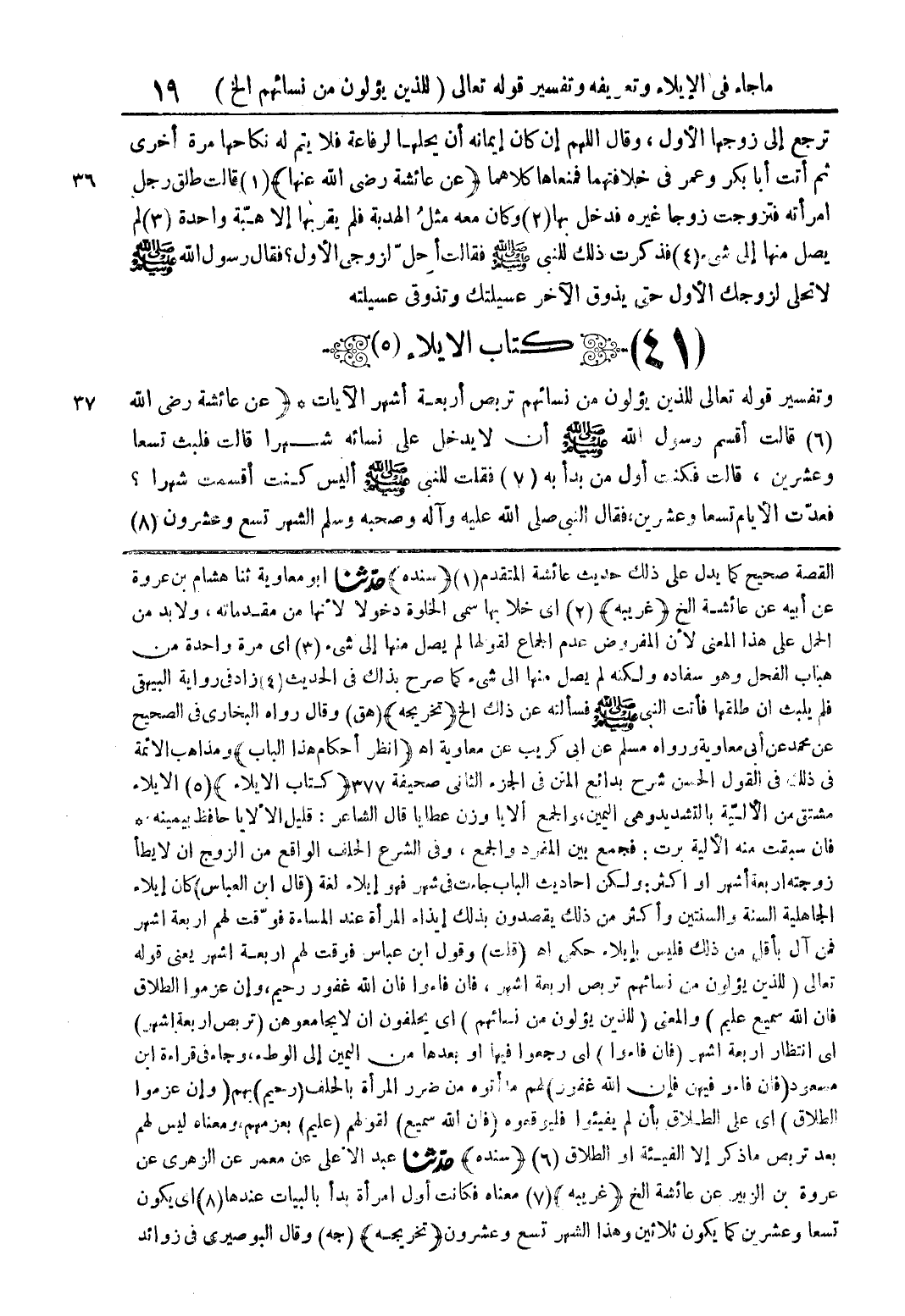 وتفسير قوله تعالى للذين يؤلون من نسائهم تربص أربعة أشهر الآيات (عن عائشة رضي الله قالت أقسم رسول الله صلى الله عليه وسلم أن لا يدخل على نسائه شهرا قالت فلبث تسعا وعشرين، قالت فكنت أول من بدأ به فقلت للنبي صلى الله عليه وسلم أليس كنت أقسمت شهرا؟ فعدت الأيام تسعا وعشرين، فقال النبي صلى الله عليه وآله وصحبه وسلم الشهر تسع وعشرون