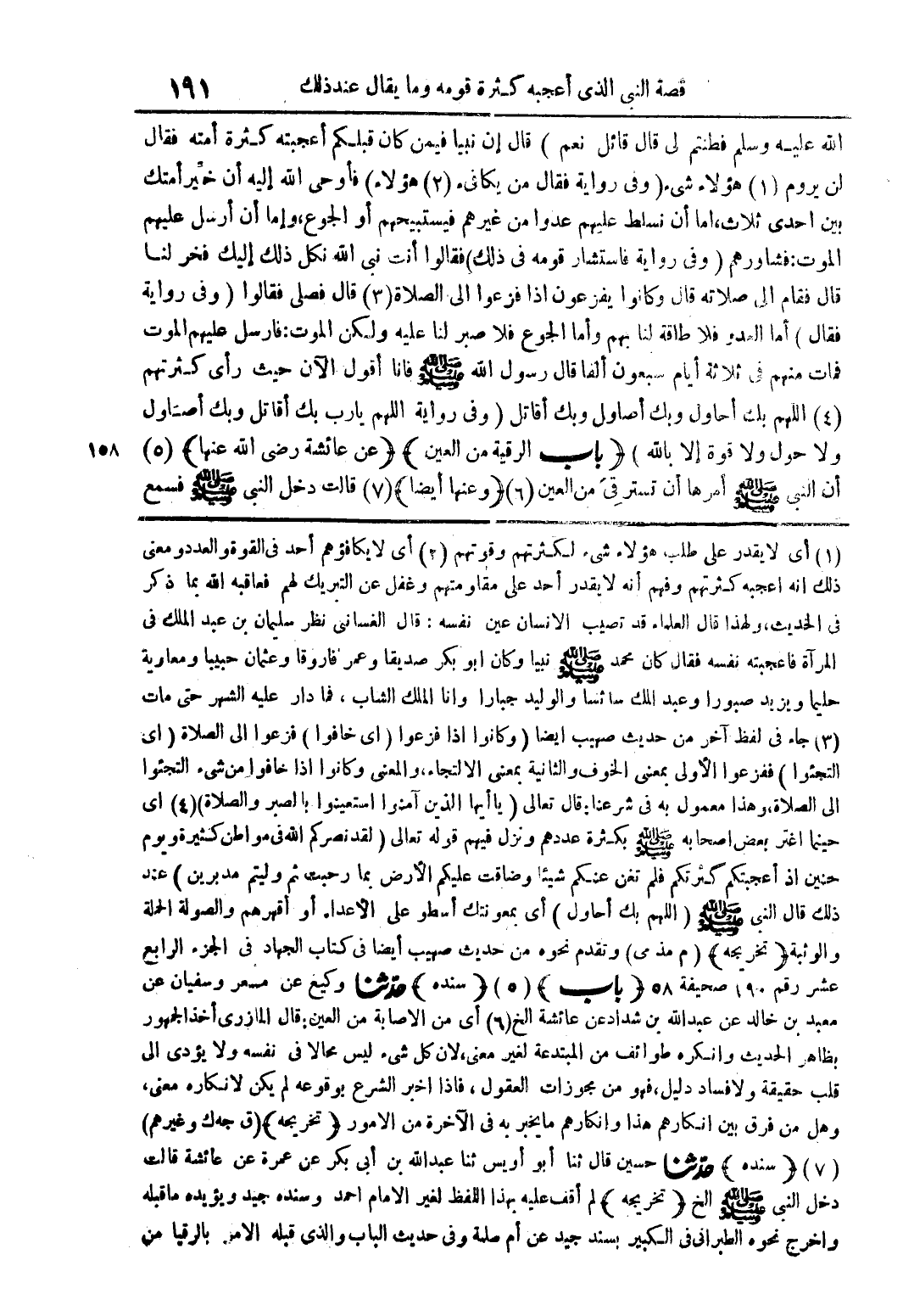 الله عليه وسلم فطنتم لى قال قائل نعم) قال إن نبياً فيمن كان قبلكم أعجبته كثرة أمته فقال لن يروم (1) هؤلاء شئ (وفى رواية فقال من يكافئ (2) هؤلاء) فأوحى الله إليه أن خِّير أمتك بين إحدى ثلاث، إما أن نسلط عليهم عدواً من غيرهم فيستبيحهم أو الجوع، وإما أن أرسل عليهم الموت: فشاورهم (وفى رواية فاستشار قومه في ذلك) فقالوا أنت نبى الله نكل ذلك إليك فخر لنا قال فقام إلى صلاته قال وكانوا يفزعون إذا فزعوا إلى الصلاة (3) قال فصلى فقالوا (وفى رواية فقال) أما العدو فلا طاقة لنا بهم وأما الجوع فلا صبر لنا عليه ولكن الموت: فأرسل عليهم الموت فمات منهم في ثلاثة أيام سبعون ألفاً قال رسول الله صلى الله عليه وسلم فأنا أقول الآن حيث رأى كثرتهم (4) اللهم بك أحاول وبك أصاول وبك أقاتل (وفى رواية اللهم يارب بك أقاتل وبك أصاول ولا حول ولا قوة إلا بالله) (باب الرقية من العين) (عن عائشة رضى لاله عنها) (5) أن النبى صلى الله عليه وسلم أمرها أن تسترقى من العين (6) (وعنها أيضاً) (7) قالت دخل النبي صلى الله عليه وسلم فسمع