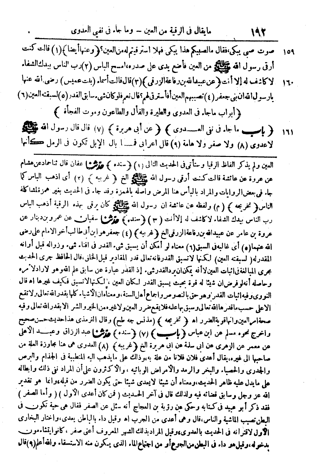 العين ولم يذكر الفاظ الرقيا وستاتى فى الحديث التالى (1) (سندة) حدثنا عفان قال ثنا حماد عن هشم عن عروة عن عائشة قالت كنت ارقى رسول اللة صلى اللة عليةوسلم الخ (غريبة) (2) اى اذهب الباسر كما جاء فى بعض الروايات والمراد بالباس هنا المرض واصلة بالهمزة وقد جاء فى الحديث بغير همزة لمشا كلة الناس (تخريجة) (م) ولفظة عن عائشة ان رسول اللة صلى اللة علية وسلم كان يرقى بهذة الرقية اذهب الباس بيدك الشفاء لا كاشف لة الا انت (3) (سندة 9 حدثنا سفيان عن عمرو بن دينار عن عروة بن عامر عن عبيد اللة بن رفاعه الزرقى الخ (غريبة) (4) جعفر هو ابن ابى طالب او الامام على رضى اللة عنهما (59 اى غالبة فى السبق (6) معناه لو امكن ان يسبق شئ القدر فى افناء شى وزوالة قبل اوانة المقدر لة (لسبقتة العين) لكنها لا تسبق القدر فانة تعالى قدر المقادير قبل الخلق قال الحافظ جرى الحديث مجرى المبالغة فى اثبات العين لا انة يمكن ان يرد القدر شئ اذا القدر عبارة عن سياق علم اللة وهو لا راد لامرة وحاصلة انة لو فرض ان شيئا لة قوة بحيث يسبق القدر لكان العين لكنها لا تسبق فكيف غيرها اه قال النووى وفية اثبات القدر وهو حق بالنصوص واجماع اهل الستة ومعناه ان الاشياء كلها بقدر اللة تعالى ولا تقطع وفية صحة امر العين وانها قوية الضرر اه (تخريجة) (مذ نس جة طح) وقال الترمذى هذا حديث حسن صحيح واخرج نحوة مسلم عن ابن عباس (باب) (7) (سندة) حدثنا عبد الرزاق وعبد الاعلى عن معمر عن الزهرى عن ابى سلمة عن ابى هريرة الخ (غريبة) (8) العدوى هى هنا مجاوزة العلة من صاحبها الى غيرة يقال اعدى فلان فلانا من علة بة وذلك على ما يذهب الية المتطببة فى الجذم والبرص والجدرى والحصباء والبر والرمد والامراض الوبائية والاكثرون على ان المراد نفى ذلك وابطالة على ما يدل علية الظاهر الحديث ومعناه ان شيئا لا يعدى شيئا حتى يكون الضرر من قبلة هو تقدير اللة عز وجل وسابق قضائة فية ولذلك قال فى ار الحديث (فمن كان اعدى الاول (واما الصفر فقد ذكر ابو عبيد فى كتابة وحكى عن روية بن العجاج انة سئل عن الصفر فقال هى حية تكون فى البطن تصيب الماشية والناس قال وهى اعدى من الجرب اه وقيل داء بالباطن يعدى واتار البخارى الاول لاقترانة فى الحديث بالعدوى وقيل المراد بذلك الشهر المعروف اعنى صفر كانوا يتشاءمون بدولة وقيل هو داء فى البطن من الجوع او من اجتماع الماء الذى يكون منة الاستسقاء والله أعلم (9) قال