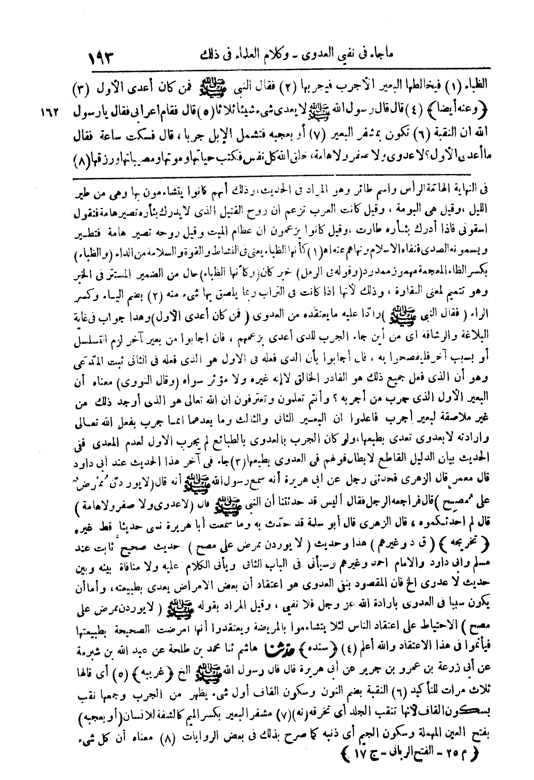 في النهاية الهامة الراس واسم الطائر وهو المراد من الحديث وذلك انهم كانوا يتشاءمون بها وهى من طير الليل وقيل هى البومة وقيل كانت العرب تزعم ان روح القتيل الذى لا يدرك بثارة نصير هامة فتقول اسقونى فاذا ادرك بثارة طارت وقيل كانوا يزعمون ان عظام الميت وقيل روحة تصير هامة فتطير ويسمونة الصدى فنقاه الاسلام ونهاهم عنة اه (1) كانها الظباء يعنى فى النشاط والقوة والسلامة من الداء (والظباء) بكسر الظاء المعجمة وهى تتميم لمعنى النقاوة وذلك لانها اذا كانت من التراب ربما يلصق بها شئ منة (2) بضم الياء وكسر الراء (فقال النبى صلى الللة عليةوسلم) رادا علية ما يعتقدة من العدوى (فمن كان اعدى الاول) وهذا جواب فى غاية البلاغة والرشاقة اى من اين جاء الجرب للذى اعدى بزعمهم فان اجابوا من بعير اخر لزم التسلسل او بسبب اخر فليفصحوا بة فان اجابوا بان الذى فعلة فى الاول هو الذى فعلة فى الثانى ثبت المدعى وهو ان الذى فعل جميع ذلك هو القادر الخالق لا الة غيرة ولا موثر سواه (وقال النووى) معناه ان البعير الاول الذى جرب من اجربة؟ وانتم تعلمون وتعترفون ان اللة تعالى هو الذى اوجد ذلك غير ملاصقة لبعير اجرب فاعدوا ان البعير الثانى والثالث وما بعدهما انما جرب بفعل اللة تعالى وارادتة لا بعدوى تعدى بطبعها واو كان الجرب بالعدوى بالطبائع لم يجرب الاول لعدم المعدى ففى الحديث بيان الدليل القاطع لابطال قولهم فى العدوى بطبعها (3) جاء فى اخر هذا الحديث عند ابى داود قال معمر قال الزهرى فحدثنى رجل عن ابى هريرة انة سمع رسول اللة صلى اللة علية وسلم انة قال (لا يوردن ممرض على مصح) قال فراجعة فقال اليس قد حدثنا ان النبى صلى اللة عليةوسلم قال (لا عدوى ولا صفرو هامة) قال لم احد ثكموه قال الزهرى قال ابو سلمة قد حدث بة وما سمعت ابا هريرة نسى حديثا قط غيرة (تخريجة) (ق د وغيرهم) هذا وحديث (ولا يوردن ممرض على مصح) حديث صحيح ثابت عند مسلم وابى داودو الامام احمد وغيرهم وسياتى فى الباب الثانى وياتى الكلام علية ولا منافاه بينة وبين حديث لا عدوى الخ فان المقصود بنفى العدوى هو اعتقاد ان بعض الامراض يعدى بطبيعتة واما ان يكون سببا فى العدوى بارادة اللة عز وجل فلا نفى وقيل المراد بقولة صلى اللة علية وسلم (لا يوردن ممرض على مصح) الاحتياط على اعتقاد الناس لئلا يتشاءموا بالمريضة ويعتقدوا انها مرضت الصحيحة بطبيعتها فيائموا فى هذا الاعتقاد واللة اعلم (4) (سندة) حدثنا هاشم ثنا محمد بن طلحة عن عبد اللة بن شبرمة عن ابى زرعة بن عمرو بن جرير عن ابىهريرة قال قال رسول اللة صلى اللة علية وسلم الخ (غريبة) (5) اى قالها ثلاث مرات للتاكيد (6) النقبة بضم النون وسكون القاف اول شئ يظهر من الجرب وجمعها نقب بسكون القاف لانها تنقب الجلد اى تخرقة (نة) (7) مشفر البعير بكسر الميم كالشفة للانسان (او بعجبة) بفتح العين المهملة وسكون الجيم اى ذنبة كما صرح بذلك فى بعض الروايات (8) معناه أن كل شيء