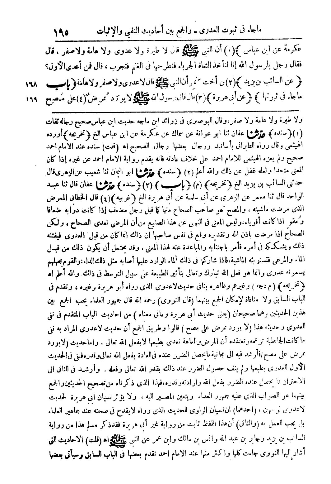 عكرمة عن ابن عباس) 01) أن النبى صلى الله عليه وسلم قال لا طيرة ولا عدوى ولا هامة ولا صفر، قال فقال رجل يا رسول الله إنا لنأخذ الشاة الجرباء فنطرحها في الغنم فتجرب، قال فمن أعدى الأول؟ (عن السائب بن يزيد) (2) بن أخت نمر أن النبى صلى الله عليه وسلم قال لا عدوى ولا صفر ولا هامة (باب ما جاء في ثبوتها) (عن أبى هريرة (3) قال قال رسول الله صلى الله عليه وسلم لا يورد ممرض (4) على مصح