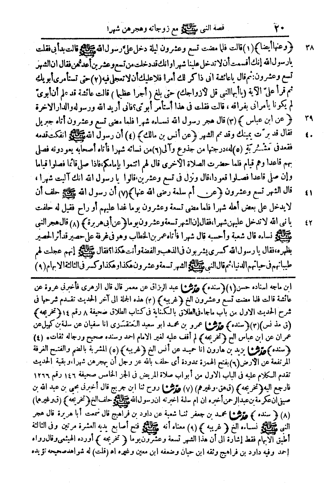 (وعنها أيضا) قالت فلما مضت تسع وعشرون ليلة دخل علي رسول الله صلى الله عليه وسلم قالت بدأ بي فقلت يا رسول الله إنك أقسمت أن لا تدخل علينا شهر أو أنك قد دخلت من تسع وعشرين أعدهن فقال أن الشهر تسع وعشرون: ثم قال يا عائشة إني ذاكر لك أمرا فلا عليك أن لا تعجلي فيه حتى تستأمري أبويك ثم قرأ علي الآية {يا أيها النبي قل لأزواجك} حتى بلغ {أجرا عظيما} قالت عائشة قد علم أن أبوي لم يكونا يأمراني بفراقه، قالت فقلت في هذا أستأمر أبوي؟ فإني أريد الله ورسوله والدار الآخرة (عن ابن عباس) قال هجر رسول الله نساءه شهرا فلما مضى تسع وعشرون أتاه جبريل فقال قد برت يمينك وقد تم الشهر (عن أنس بن مالك) أن رسول الله صلى الله عليه وسلم انفكت قدمه فقعد في مشربة له، درجتها من جذوع وآلي من نسائه شهرا فأتاه أصحابه يعودونه فصلى بهم قاعدا وهم قيام فلما حضرت الصلاة الأخرى قال لهم ائتموا بإمامكم، فإذا صلى قائما فصلوا قياما وإن صلى قاعدا فصلوا قعودا، قال ونزل في تسع وعشرين، قالوا يا رسول الله إنك آليت شهرا، قال الشهر تسع وعشرون (عن أم سلمة رضي الله عنها) أن رسول الله صلى الله عليه وسلم حلف أن لا يدخل على بعض أهله شهرا فلما مضى تسعة وعشرون يوما غدا عليهم أو راح فقيل له حلفت يا نبي الله لا تدخل عليهن شهرا، فقال إن الشهر تسعة وعشرون يوما (عن أبي هريرة) قال هجر النبي صلى الله عليه وسلم نساءه قال شعبة وأحسبه قال شهرا فأتاه عمر بن الخطاب وهو في غرفة على حصير قد أثر الحصير بظهره، فقال يا رسول الله كسري يشربون في الذهب والفضة وأنت هكذا؟ فقال صلى الله عليه وسلم إنهم عجلت لهم طيباتهم في حياتهم الدنيا، ثم قال النبي صلى الله عليه وسلم الشهر تسعة وعشرون هكذا وهكذا وكسر في الثالثة الإبهام
