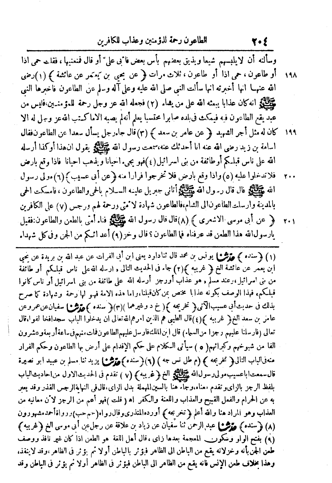 (1) (سنده) حدثنا يونس بن محمد قال ثنا داود يعنى ابن ابى الفرات عن عبد اللة بن بريدة عن يحيى ابن يعمر ععن عائشة الخ (غريبة) (2) جاء فى الحديث ارسلة اللة تعالى على ناس قبلكم او طائفة من بنى اسرائيل وعند مسلم وهو عذاب اورجز ارسلة اللة على طائفة من بنى اسرائيل او ناس كانوا قبلكم فهذا الوصف بكونة عذابا مختص بمن كان قبلنا واما هذة الامة فهو لها رحمة وشهادة كما صرح بذلك فى حديث ابى عسيب الاتى (تخريجة) (خ د وغيرهم) (3) (سندة) حدثنا سفيان عن عمرو عن عامر بن سعد الخ (غريبة) (4) قال الطيىهم اللذين امرهم اللة تعالى ان يدخلوا الباب سجد افخا لفوا قال تعالى (فارسلنا عليهم وجزا من السماء) قال ابن الملك فارسل عليهم الطاعون فمات منهم فى ساعة اربعة وعشرين الفا من شبوخهم وكبرائهم (5) سياتى الكلام على حكم الاقدام على ارض بها الطاعون وحكم الفرار منة فى الباب التالى (تخريجة) (م طل نس جة) (6) (سندة) حدثنا يزيد ثنا مسلم بن عبيد ابو نصيرة قال سمعت ابا عسيب مولى رسول اللة صلى اللة علية وسلم الخ (غريبة) (7) تقدم فى الحديث الاول من احاديث الباب بلفظ الرجز بالزاى وتقدم معناه وجاء هنا بالسين المهملة بدل الزاى قال فى النهاية الجس القذر وقد يعبر بة عن الحرام والفعل القبيح والعذاب واللعنة والكفر اه (قلت) فهو اعم من الرجز لان معانية من العذاب وهو المراد هنا واللة اعلم (تخريجة) اوردة المنذرى وقال رواه (حم حب) ورواه احمد مشهوران (8) (سندة) حدثنا عبد الرحمن ثنا سفيان عن زيادة بن علاقة عن رجل عن ابى موسى الخ (غريبة) (9) بفتح الواو وسكون المعجمة بعدها زاى قال اهل اللغة هو الطعن اذا الطعن كان غير نافذ ووصف طعن الجن بانة وخز وخزلانة يقع من الباطن الى الظاهر فيوثر بالباطن اولا ثم يوثر فى الظاهر وقد لا ينقذ وهذا بخلاف طعن الانس فانة يقع من الظاهر الى الباطن فيوثر فى الظاهر اولا ثم يوثر في الباطن وقد