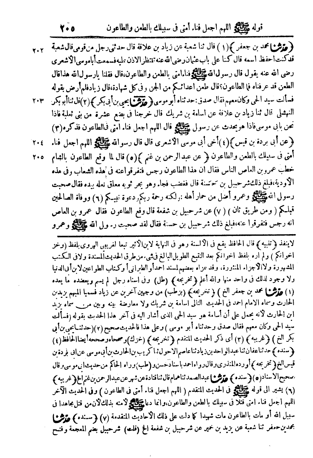 (حدّثنا محمد بن جعفر) (1) قال ثنا شعبة عن زياد بن علاقة قال حدثنى رجل من قومى قال شعبة قد كنت أحفظ اسمه قال كنا على باب عثمان رضى الله عنه ننتظر الإذن عليه فسمعت أبا موسى الأشعرى رضى الله عنه يقول قال رسول الله صلى الله عليه وسلم فناء أمتى بالطعن والطاعون، قال فقلنا يا رسول الله هذا قال الطعن قد عرفناه فما الطاعون؟ قال طعن أعدائكم من الجن وفى كل شهادة، قال زياد فلم أرض بقوله فسألت سيد الحى وكان معهم فقال صدق: حدثناه أبو موسى (حدّثنا يحيى بن أبى بكر) (2) قال ثنا أبو بكر النهشلى قال ثنا زياد بن علاقة عن أسامة بن شريك قال خرجنا في بضع عشرة من بنى ثعلبة فإذا نحن بأبى فإذا هو يحدث عن رسول الله صلى الله عليه وسلم قال اللهم اجعل فناء أمتى في الطاعون فذكره (3) (عن أبى بردة بن قيس) (4) أخى أبى موسى الأشعرى قال قال رسول الله صلى الله عليه وسلم اللهم اجعل فناء أمتى في سبيلك بالطعن والطاعون (عن عبد الرحمن بن غنم) (5) قال لما وقع الطاعون بالشام خطب عمرو بن العاص الناس فقال إن هذا الطاعون رجس فتفرقوا عنه في هذه الشعاب وفى هذه الأودية، فبلغ ذلك شرحبيل بن حسنة قال فغضب فجاء وهو يجر ثوبه معلق نعله بيده فقال صحبت رسول الله صلى الله عليه وسلم وعمر أضل من حمار أهله: ولكنه رحمة ربكم ودعوة نبيكم (6) ووفاة الصالحين قبلكم (ومن طريق ثان) (7) عن شرحبيل بن شفعة قال وقع الطاعون فقال عمرو بن العاص إنه رجس فتفرقوا عنه، فبلغ ذلك شرحبيل بن حسنة فقال لقد صحبت رسول الله صلى الله عليه وسلم وعمرو