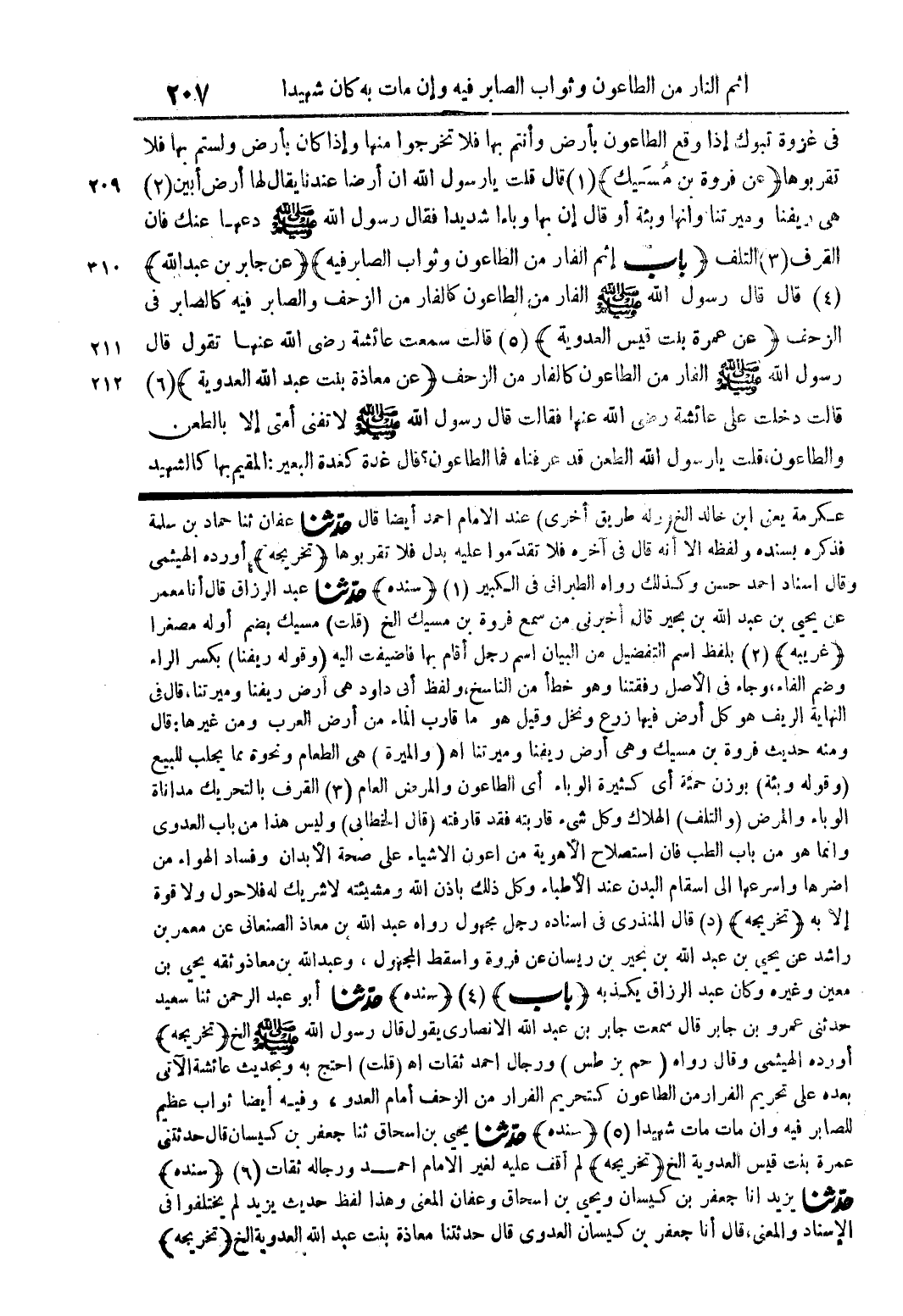 في غزوة تبوك إذا وقع الطاعون بأرض وأنتم بها فلا تخرجوا منها وإذا كان بأرض ولستم بها فلا تقربوها (عن فروة بن مسيك) (1) قال قلت يا رسول الله إن أرضاً عندنا يقال لها أرض أبين (2) هى ريفنا وميرتنا وأنها وبئة أو قال إن بها وباءاً شديداً فقال رسول الله صلى الله عليه وسلم دعها عنك فإن القرف (3) التلف (باب إثم الفار من الطاعون وثواب الصابر فيه) (عن جابر بن عبد الله (4) قال قال رسول الله صلى الله عليه وسلم الفار من الطاعون كالفار من الزحف والصابر فيه كالصابر في الزحف (عن عمرة بنت قيس العدوية) (5) قالت سمعت عائشة رضى الله عنها تقول قال رسول الله صلى الله عليه وسلم الفار من الطاعون كالفار من الزحف (عن معاذة بنت عبد الله العدوية) (6) قالت دخلت على عائشة رضى الله عنها فقالت قال رسول الله صلى الله عليه وسلم لا تفنى أمتى إلا بالطعن والطاعون، قلت يا رسول الله الطعن قد عرفناه فما الطاعون؟ قال غدة كغدة البعير: المقيم بها كالشهيد