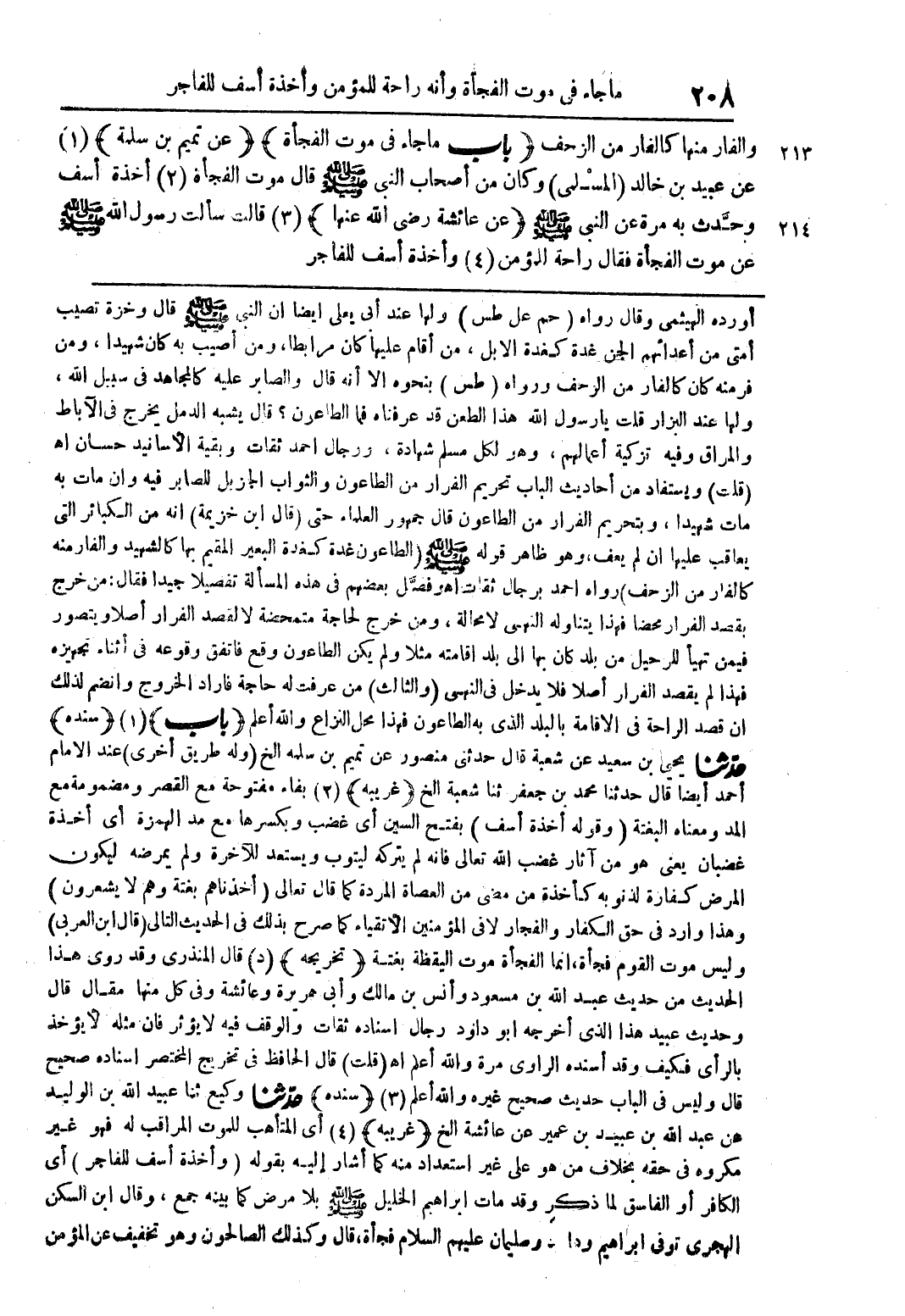 والفار منها كالفار من الزحف (باب ما جاء في موت الفجأة) عن تميم بن سلمة) (1) عن عبيد بن خالد (المسلمى) وكان من أصحاب النبى صلى الله عليه وسلم قال موت الفجأة (2) أخذة أسف وحدِّث به مرة عن النبى صلى الله عليه وسلم (عن عائشة رضى الله عنها) (3) قالت سالت رسول الله صلى الله عليه وسلم عن موت الفجأة فقال راحة للمؤمن (4) وأخذة أسف للفاجر