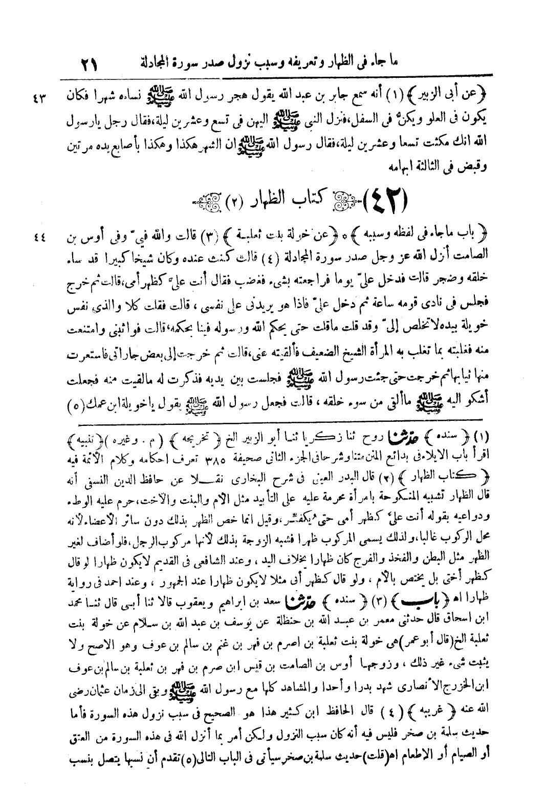 (1) (سنده) حدثنا روح ثنا زكريا ثنا ابو الزبير الخ (تخريجة) (م. وغيره) (تنبية) اقرأ باب اليلاء فى بدائع المتن متنا وشرحا فى الجزء الثانى صحيفة 385 تعرف احكامة وكلام الائمة فية (كتاب الظاهر) (2) قال البدر العينى فى شرح البارى نقلا عن حافظ الدين النسفى انة قال الظهار تشبية المنكوحة بامرأة محرمة علية على التايد مثل الام والبنت والاخت وحرم علية الوطء ودواعية بقولة انت على كظهر امى حتى يكفر وقيل انما خص الظهر بذلك دون سائر الاعضاء لانة محل الركوب غالبا ولذلك يسمى المركوب ظهرا فشبة الزوجة بذلك لانها مركوب الرجل فلو اضاف لغير الظهر مثل البطن والفخد والفرج كان ظهارا يخالف اليد وعند الشافعى فى القديم لا يكون ظهارا لو قال كظهر اختى بل يختص بالام ولو قال كظهر ابى مثلا لا يكون ظهارا عند الجمهور وعند احمد فى رواية ظهارا اه (باب) (3) (سندة) حدثنا سعد بن ابراهيم ويعقوب قالا ثنا ابى قال ثنا محمد ابن اسحاق قال حدثنى معمر بن عبد اللة بن حنظلة عن يوسف بن عبد اللة بن سلام عن خولة بنت ثعلبة الخ (قال ابو عمر) وهى ولة بنت ثعلبة بن اصرم بن فهر بن غنم بن سالم بن عوف وهو الاصح ولا يثبت شئ غير ذلك وزوجها اوس بن الصامت بن قيس ابن صرم بن فهر بن ثعلبة بن سالم بن عوف ابن الخزرج الانصارى شهد بدرا واحد والمشاهد كلها مع رسول اللة صلى اللة علية وسلم وبقى الى زمان عثمان رضى اللة عنة (غريبة) (4) قال الحافظ ابن كثير هذا هو الصحيح فى سبب نزول هذه السوره فأما حديث سلمة بن صخر فليس فية انة كان سبب النزول ولكن امر بما انزل اللة فى هذة السورة من العتق او الصيام او الاطعام اه (قلت) حدحيث سلمة بن صخر سيأتى فى الباب التالى (5) تقدم ان نسبها يتصل بنسب
