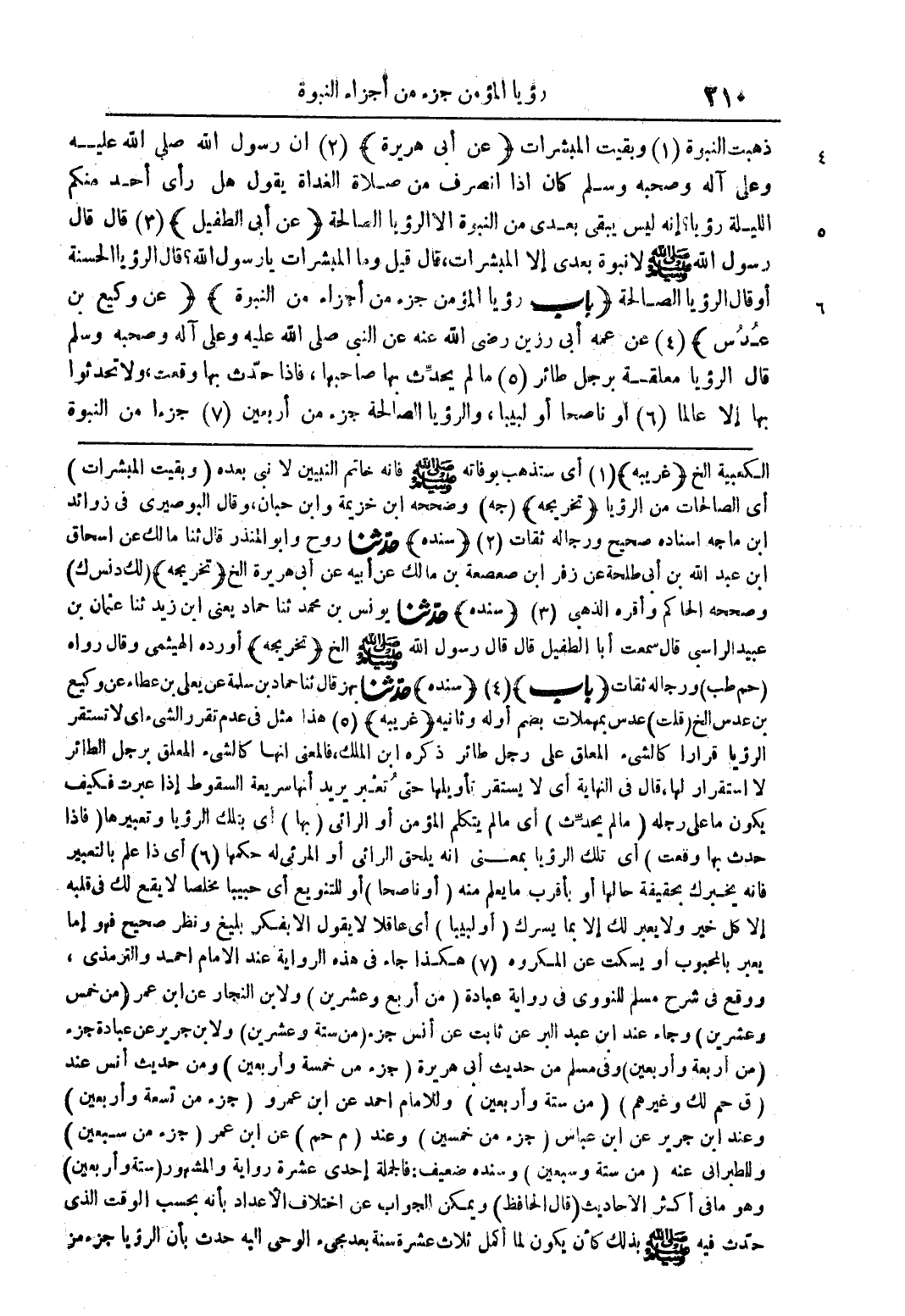 ذهبت النبوة (1) وبقيت المبشرات (عن أبي هريرة) (2) أن رسول الله صلى الله عليه وعلى آله وصحبه وسلم كان إذا انصرف من صلاة الغداة يقول هل رأى أحد منكم الليلة رؤيا؟ إنه ليس يبقى بعدي من النبوة إلا الرؤيا الصالحة (عن أبي الطفيل) (3) قال قال رسول الله صلى الله عليه وسلم لا نبوة بعدي إلا المبشرات، قال قيل وما المبشرات يا رسول الله؟ قال الرؤيا الحسنة أو قال الرؤيا الصالحة (باب رؤيا المؤمن جزء من أجزاء من النبوة) (عن وكيع بن عدس) (4) عن عمه أبي رزين رضي الله عنه عن النبي صلى الله عليه وعلى آله وصحبه وسلم قال الرؤيا معلقة برجل طائر (5) ما لم يحدث بها صاحبها، فإذا حدث بها وقعت، ولا تحدثوا بها إلا عالمًا (6) أو ناصحًا أو لبيبًا، والرؤيا الصالحة جزء من أربعين (7) جزءًا من النبوة