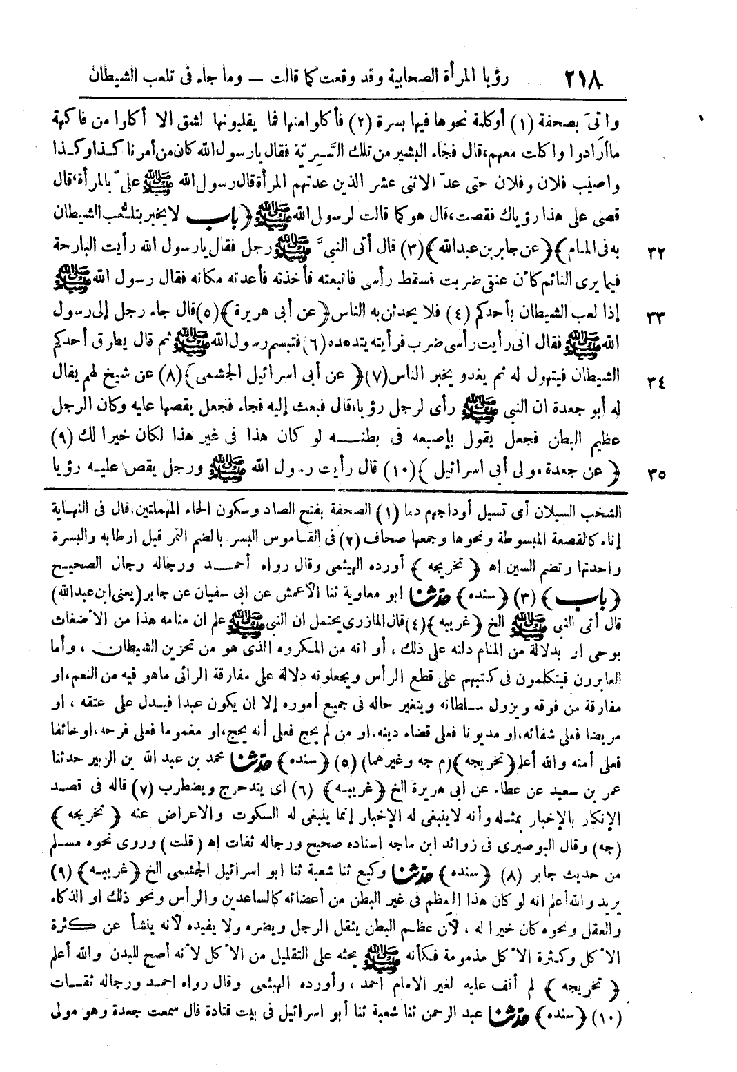 وأتىَ بصحفة (1) أو كلمة نحوها فيها بسرة (2) فأكلوا منها يقلبونها لشق الا أكلوا من فاكهة ما أرَادوا واكلت معهم، قال فجاء البشير من تلك السَّرِيّة فقال يا رسول الله كان من أمرنا كذا وكذا واصيب فلان وفلان حتى عدّ الاثنى عشر الذين عدتهم المرأة قال رسول الله صلى الله عليه وسلم علىّ بالمرأة، قال قصى على هذا رؤياك فقصصت، قال هو كما قالت لرسول الله صلى الله عليه وسلم (باب لا يخبز بتلعُّب الشيطان به في المنام) (عن جابر بن عبد الله) (3) قال أتى النبىَّ صلى الله عليه وسلم رجل فقال يا رسول الله رأيت البارحة فيما يرى النائم كأن عنقى ضربت فسقط رأسى فاتبعته فأخذته فأعدته مكانه فقال رسول الله صلى الله عليه وسلم إذا لعب الشيطان بأحدكم (4) فلا يحدثن به الناس (عن أبى هريرة) (5) قال جاء رجل إلى رسول الله صلى الله عليه وسلم فقال انى رأيت رأسى ضرب فرأيته يتهدهده (6) فتبسم رسول الله صلى الله عليه وسلم ثم قال يطرق أحدكم الشيطان فيتهول له ثم يغدو يخبر الناس (7) (عن أبى اسرائيل الجشمى) (8) عن شيخ لهم يقال له أبو جعدة أن النبي صلى الله عليه وسلم رأى لرجل رؤيا، قال فبعث إليه فجاء فجعل يقصها عليه وكان الرجل عظيم البطن فجعل يقول بإصبعه في بطنه لو كان هذا في غير هذا لكان خيرا لك (9) (عن جعدة مولى ابى اسرائيل) (10) قال رأست رسول الله صلى الله عليه وسلم ورجل يقص عليه رؤيا