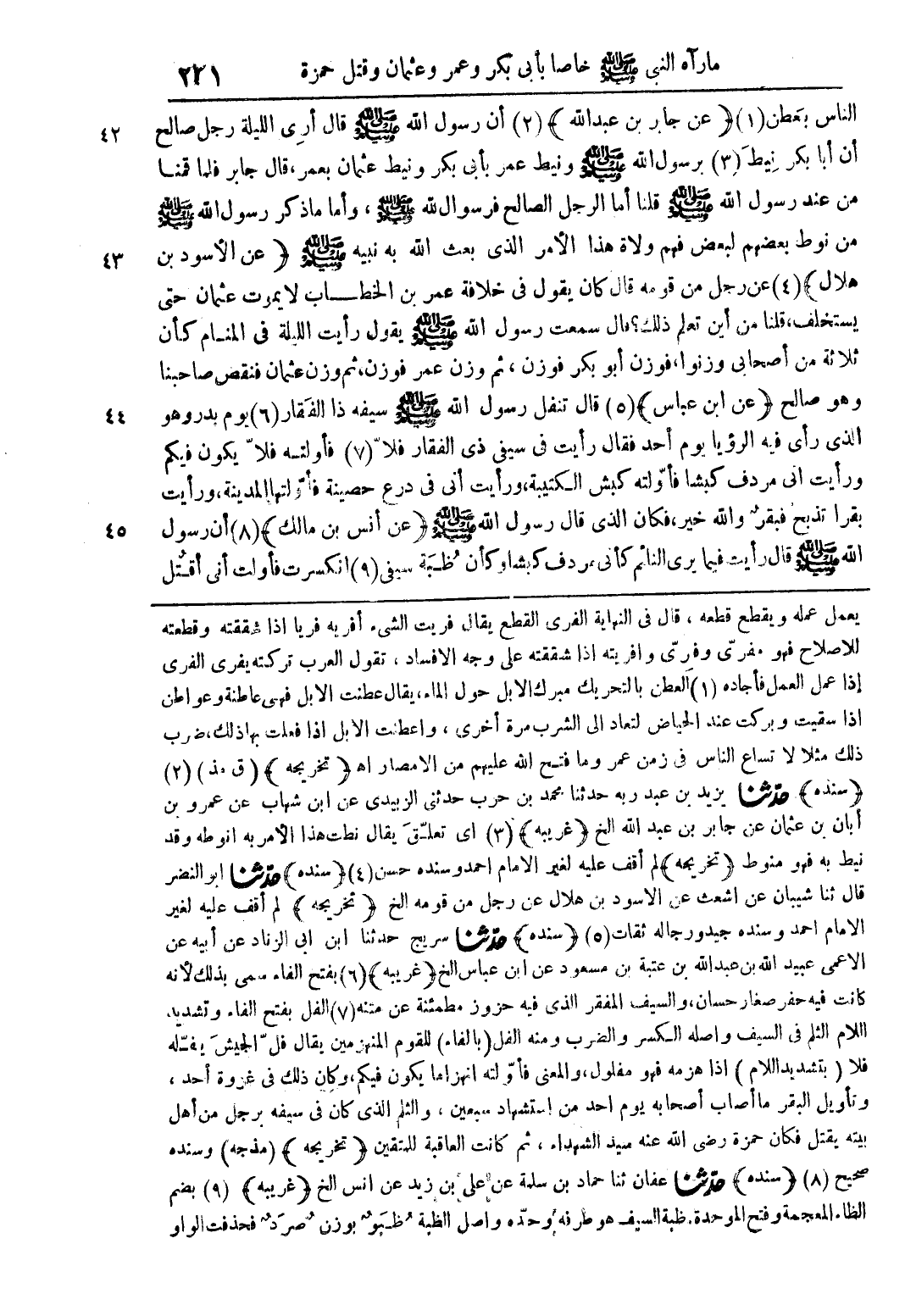 الناس بَعطن (1) (عن جابر بن عبد الله) (2) أن رسول الله صلى الله عليه وسلم قال أرِى الليلة رجل صالح أن أبا بكر نِيطَ (3) برسول الله صلى الله عليه وسلم ونيط عمر بأبي بكر ونيط عثمان بعمر، قال جابر فلما قمنا من عند رسول الله صلى الله عليه وسلم قلنا أما الرجل الصالح فرسول الله صلى الله عليه وسلم، وأما ما ذكر رسول الله صلى الله عليه وسلم من نوط بعضهم لبعض فهم ولاة هذا الأمر الذي بعث الله به نبيه صلى الله عليه وسلم (عن الأسود بن هلال) (4) عن رجل من قومه قال كان يقول في خلافة عمر بن الخطاب لا يموت عثمان حتى يستخلف، قلنا من أين تعلم ذلك؟ قال سمعت رسول الله صلى الله عليه وسلم يقول رأيت الليلة في المنام كأن ثلاثة من أصحابي وزنوا، فوزن أبو بكر فوزن، ثم وزن عمر فوزن، ثم وزن عثمان فنقص صاحبنا وهو صالح (عن ابن عباس) (5) قال تنفل رسول الله صلى الله عليه وسلم سيفه ذا الفَقار (6) يوم بدر وهو الذي رأى فيه الرؤيا يوم أحد فقال رأيت في سيفي ذي الفقار فلاّ (7) فأولته فلاّ يكون فيكم ورأيت أني مردف كبشا فأوّلته كبش الكتيبة، ورأيت أني في درع حصينة فأوّلتها المدينة، ورأيت بقرا تذبح فبقرٌ والله خير، فكان الذي قال رسول الله صلى الله عليه وسلم (عن أنس بن مالك) (8) أن رسول الله صلى الله عليه وسلم قال رأيت فيما يرى النائم كأني مردف كبشا وكأن ظُبَة سيفي (9) انكسرت فأولت أني أقتُل