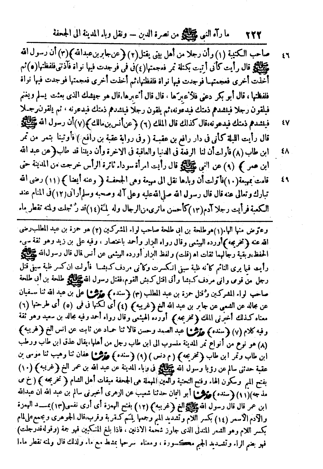 وعوّض منها الهاء (1) هو طلحة بن أبي طلحة صاحب لواء المشركين (2) هو حمزة بن عبد المطلب رضي الله عنه (تخريجه) أورده الهيثمي وقال رواه البزار وأحمد باختصار، وفيه علي بن زيد وهو ثقة سيئ الحفظ، وبقية رجالهما ثقات اهـ (قلت) ولفظ البزار أورده الهيثمي عن أنس قال قال رسول الله صلى الله عليه وسلم رأيت فيما يرى النائم كأنه ظبة سيفي أنكسرت وكأني مردف كبشا فأولت أن كسر ظبة سيفي قتل رجل من قومي وأني مردف كبشا وأني أقتل كبش القوم، فقتل رسول الله صلى الله عليه وسلم طلحة بن أبي طلحة صاحب لواء المشركين وقُتل حمزة بن عبد المطلب (3) (سنده) حدّثنا علي بن عبد الله ثنا سفيان عن مجالد عن الشعبي عن جابر بن عبد الله الخ (غريبه) (4) أي لكنها في فمي (5) أي طرحتها (6) معناه كذلك أخبرني الملك (تخريجه) أورده الهيثمي وقال رواه أحمد وفيه مجالد بن سعيد وهو ثقة وفيه كلام (7) (سنده) حدّثنا عبد الصمد وحسن قالا ثنا حماد عن ثابت عن أنس الخ (غريبه) (8) هو نوع من أنواع تمر المدينة منسوب إلى ابن طاب رجل من أهلها، يقال عذق ابن طاب ورطب ابن طاب وتمر ابن طاب (تخريجه) (م دنس) (9) (سنده) حدّثنا عفان ثنا وهيب ثنا موسى بن عقبة حدثني سالم عن رؤيا رسول الله صلى الله عليه وسلم في وباء المدينة عن عبد الله بن عمر الخ (غريبه) (10) بفتح الميم وسكون الهاء وفتح التحتية والعين المهملة هي الجحفة ميقات أهل الشام (تخريجه) (خ مي مذ جه) (11) (سنده) حدّثنا أبو اليمان حدثنا شعيب عن الزهري أخبرني سالم بن عبد الله أن عبد الله ابن عمر قال قال رسول الله صلى الله عليه وسلم الخ (غريبه) (12) بفتح الهمزة أي أرى نفسي (13) بمد الهمزة والآدم الأسمر (14) بكسر اللام وتشديد الميم وجمعها لِمَم كقربة وقرب، قال الجوهري ويجمع على لمام بكسر اللام وهو الشعر المتدلى الذي جاوز شحمه الأذنين، فإذا بلغ المنكبين فهو جمة (وقوله قدر جلت) فهو بضم الراء وتشديد الجيم مكسورة، ومعناه سرحها بمشط مع ماء ولذلك قال ولمته تقطر ماءا