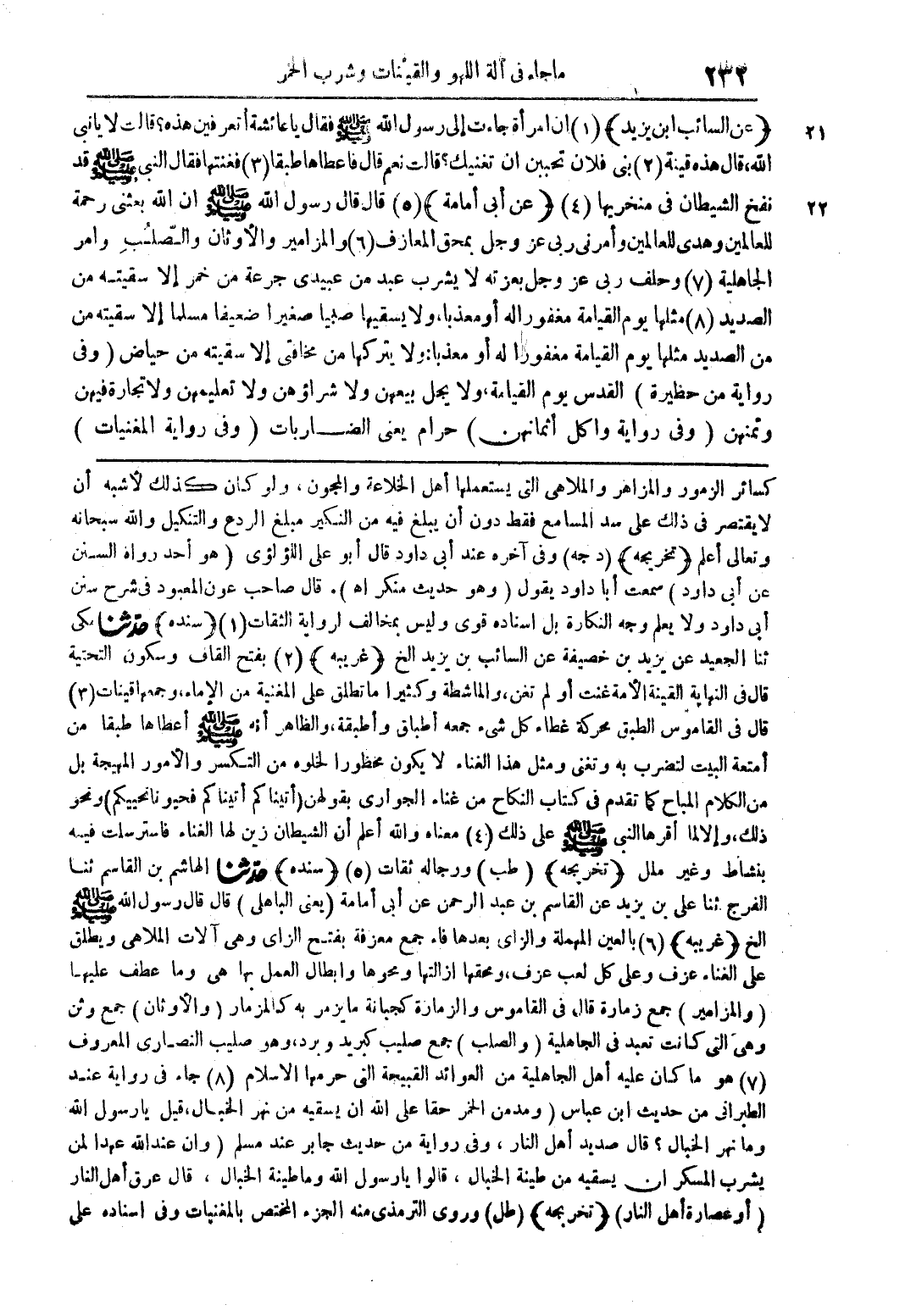 (عن السائب ابن يزيد) (1) أن امرأة جاءت إلى رسول الله صلى الله عليه وسلم فقال يا عائشة أتعرفين هذه؟ قالت لا يا نبي الله، قال هذه قينة (2) بني فلان تحببن أن تغنيك؟ قالت نعم قال فأعطاها طبقا (3) فغنتها فقال النبي صلى الله عليه وسلم قد نفخ الشيطان في منخريها (4) (عن أبي أمامة) (5) قال قال رسول الله صلى الله عليه وسلم أن الله بعثني رحمة للعالمين وهدى للعالمين وأمرني ربي عز وجل بمحق المعازف (6) والمزامير والأوثان والصلب وأمر الجاهلية (7) وحلف ربي عز وجل بعزته لا يشرب عبد من عبيدي جرعة من خمر إلا سقيته من الصديد (8) مثلها يوم القيامة مغفور اله أو معذبا، ولا يسقيها صبيا صغيرا ضعيفا مسلما إلا سقيته من الصديد مثلها يوم القيامة مغفورا له أو معذبا: ولا يتركها من مخافتي إلا سقيته من حياض (وفي رواية من حظيرة) القدس يوم القيامة، ولا يجل بيعهن ولا شراؤهن ولا تعليمهن ولا تجارة فيهن وثمنهن (وفي رواية وأكل أثمانهن) حرام يعني الضاربات (وفي رواية المغنيات)