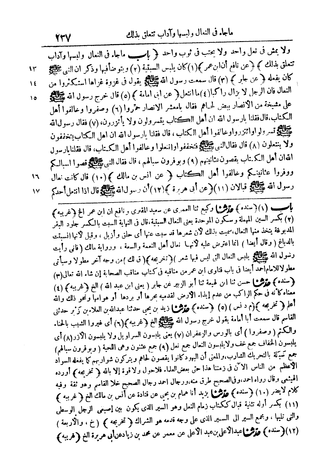 باب (1) (سنده) حدثنا وكيع ثنا العمري عن سعيد المقتري ونافع ابن عمر الخ (غريبه) (2) بكسر السين المهملة وسكون الموحدة يعني النعال السبتية، قال في النهاية السبت بالكسر جلود البقرة المدبوغة يتخذ منها النعال، سميت بذلك لأن شعرها قد سبت عنها أن حلق وأزيل، وقيل لأنها انسبتت بالدباغ (وقال أيضا) إنما اعترض عليه لأنها نعال أهل النعمة والسعة، ورواية مالك (فإني رأيت رسول الله صلى الله عليه وسلم يلبس النعال التي ليس فيه شعر) (تخريجه) (ق لك) من وجه آخر مطولا وسيأتي مطولا للإمام أحمد أيضا في باب فتاوى ابن عمر من مناقبه في كتاب مناقب الصحابة إن شاء الله تعالى (3) (سنده) حدثنا حسن ثنا ابن لهيعة ثنا أبو الزبير عن جابر (يعني ابن عبد الله) الخ (غريبه) (4) معناه كأنه في حكم الراكب من عدم إيذاء الأرض لقدميه بحرها أو بردها أو هوامها ونحو ذلك والله أعلم (تخريجه) (م د نس) (5) (سنده) حدثنا زيد بن يحيى حدثنا عبد الله بن العلاء بن زبر حدثني القاسم قال سمعت أبا أمامة يقول خرج رسول الله صلى الله عليه وسلم الخ (غريبه) (6) أي غيروا الشيب بالحناء والكتم (وصفروا) أي بالورس والزعفران (7) يعني يلبسون السراويل ولا يلبسون الأزر (8) أي يلبسون الخفاف جمع خف ولا يلبسون النعال جمع نعل (9) جمع عثنون وهي اللحية (ويوفرون سبالهم) جمع سبلة بالتحريك الشارب، والمعنى أن اليهود كانوا يقصون لحالهم ويتركون شواربهم كما يفعله السواد الأعظم من الناس الآن في زمننا هذا حتى بعض العلماء فلا حول ولا قوة إلا بالله (تخريجه) أورده الهيثمي وقال رواه أحمد، وفي الصحيح طرق منه، ورجال أحمد رجال الصحيح خلا القاسم وهو ثقة وفيه كلام لا يضر (10) (سنده) حدّثنا يزيد أنا همام بن يحيى عن قتادة عن أنس بن مالك الخ (غريبه) (11) بكسر أوله تثنية قبال ككتاب زمام النعل وهو السير الذي يكون بين إصبعي الرجل الوسطى والتي تليها، ومجمع السير إلى السير الذي على وجه قدمه هو الشراك (تخريجه) (خ، والأربعة) (12) (سنده) حدثنا عبد الأعلى بن عبد الأعلى عن معمر عن محمد بن زياد عن أبي هريرة الخ (غريبه)
