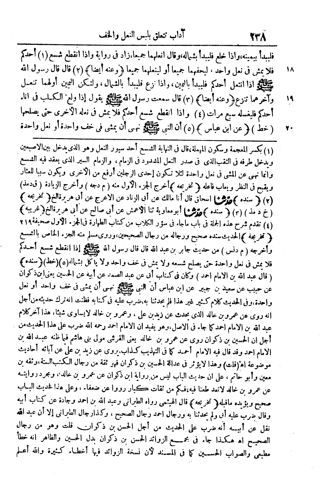 (1) بكسر المعجمة وسكون المهملة، قال في النهاية الشسع أحد سيور النعل وهو الذي يدخل بين الاصبعين ويدخل طرفه في الثقب الذي في صدر النعل المشدود في الزمام، والزمام السير الذي يعقد فيه الشسع وإنما نهى عن المشي في نعل واحدة لئلا تكون إحدى الرجلين أرفع من الأخرى ويكون سببا للعثار ويقبح في النظر ويعاب فاعله (تخريجه) أخرج الجزء الأول منه (م دجه) وأخرج الزيادة (ق دمذ) (2) (سنده) حدثنا إسحاق قال أنا مالك عن أبي الزناد عن الأعرج عن أبي هريرة الخ (تخريجه) (خ د مذ) (3) (سنده) حدّثنا أبو معاوية ثنا الأعمش عن أبي صالح عن أبي هريرة الخ (غريبه) (4) تقدم شرح هذه الجملة في باب ما جاء في سؤر الكلاب من كتاب الطهارة في الجزء الأول صحيفة 219 (تخريجه) الحديث سنده صحيح ورجاله من رجال الصحيحين، وروى مسلم منه الجزء الخاص بالشسع وأخرجه (م دنس) من حديث جابر بن عبد الله قال قال رسول الله صلى الله عليه وسلم إذا انقطع شسع أحدكم فلا يمش في نعل واحدة حتى يصلح شعسه ولا يمش في خف واحد ولا يأكل بشماله (5) (خط) (سنده) (قال عبد الله بن الامام أحمد) وكان في كتاب أبي عن عبد الصمد عن أبيه الحسين يعني ابن ذكوان عن حبيب عن سعيد بن جبير عن ابن عباس أن النبي صلى الله عليه وسلم نهى أن يمشي في خف واحد أو نعل واحدة، وفي الحديث كلام كثير غير هذا فلم يحدثنا به، ضرب عليه في كتابه فظنت أنه ترك حديثه من أجل أنه روى عن عمرو بن خالد الذي يحدث عن زيد بن علي، وعمرو بن خالد لا يساوي شيئا، هذا آخر كلام عبد الله بن الأمام أحمد كما جاء في الأصل، وهو يفيد أن الإمام أحمد رحمه الله ضرب على هذا الحديث من أجل أن الحسين بن ذكوان روى عن عمرو بن خالد يعني القرشي مولى بني هاشم فيما ظنه عبد الله بن الإمام أحمد وقد قال فيه الإمام أحمد كما في التهذيب كذاب، يروى عن زيد بن علي عن آبائه أحاديث موضوعة اهـ (قلت) وهذا لا يؤثر في عدالة الحسين بن ذكوان فهو ثقة من رجال الكتب الستة، وثقه بن معين وأبو حاتم، على أن حديث الباب ليس من رواية ابن ذكوان عن عمرو بن خالد، ومجرد روايته عن عمرو بن خالد لا تعد طعنا فيه، فكم من ثقات كبار رووا عن ضعفاء، وعلى هذا فحديث الباب صحيح ويؤيده ما قبله (تخريجه) قال الهيثمي رواه الطبراني وعبد الله بن أحمد وجادة عن كتاب أبيه وقال ضرب عليه أبي ولم يحدثنا به ورجال أحمد رجال الصحيح، وكذا رجال الطبراني إلا أن عبد الله نقل عن أبيه أنه ضرب على الحديث من أجل الحسن بن ذكوان قلت وهو من رجال الصحيح اهـ هكذا جاء في مجمع الزوائد الحسن بن ذكوان بدل الحسين والظاهر أنه خطأ مطبعي والصواب الحسين كما في المسند لأن نسخة الزوائد فيها أخطاء كثيرة والله أعلم