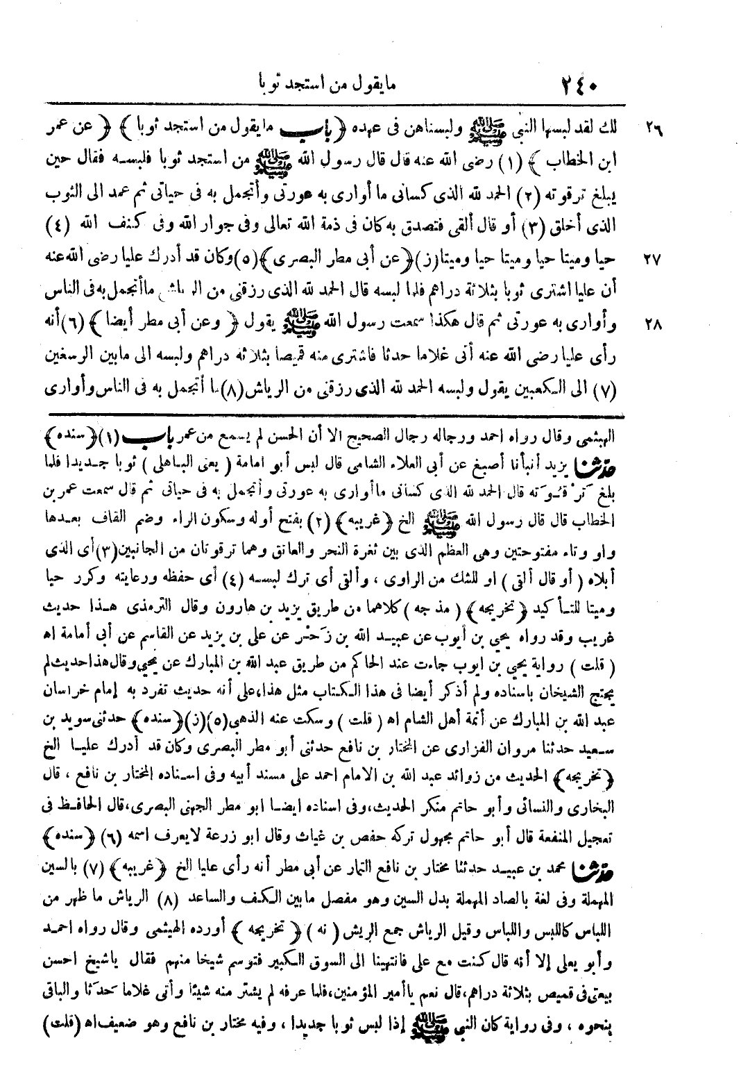 الهيثمي وقال رواه أحمد ورجاله رجال الصحيح إلا أن الحسن لم يسمع من عمر باب (1) (سنده) حدّثنا يزيد أنبأنا أصبغ عن أبي العلاء الشامي قال لبس أبو أمامة (يعني الباهلي) ثوبا جديدا فلما بلغ ترقوته قال الحمد لله الذي كساني ما أواري به عورتي وأتجمل به في حياتي ثم قال سمعت عمر بن الخطاب قال قال رسول الله صلى الله عليه وسلم الخ (غريبه) (2) بفتح أوله وسكون الراء وضم القاف بعدها واو وتاء مفتوحتين وهي العظم الذي بين ثغرة النحر والعاتق وهما ترقوتان من الجانبين (3) أي الذي أبلاه (أو قال ألقى) أو للشك من الراوي، وألقى أي ترك لبسه (4) أي حفظه ورعايته وكرر حيا وميتا للتأكيد (تخريجه) (مذ جه) كلاهما من طريق يزيد بن هارون وقال الترمذي هذا حديث غريب وقد رواه يحيى بن أيوب عن عبيد الله بن زحر عن علي بن يزيد عن القاسم عن أبي أمامه اهـ (قلت) رواية يحيى بن أيوب جاءت عند الحاكم من طريق عبد الله بن المبارك عن يحيى وقال هذا حديث لم يحتج الشيخان بإسناده ولم أذكر أيضا في هذا الكتاب مثل هذا، على أنه حديث تفرد به إمام خراسان عبد الله بن المبارك عن أئمة أهل الشام اهـ (قلت) وسكت عنه الذهبي (5) (ز) (سنده) حدثني سويد بن سعيد حدثنا مروان الفزاري عن المختار بن نافع حدثني أبو مطر البصري وكان قد أدرك عليا الخ (تخريجه) الحديث من زوائد عبد الله بن الإمام أحمد على مسند أبيه وفي إسناده المختار بن نافع، قال البخاري والنسائي وأبو حاتم منكر الحديث، وفي إسناده أيضا أبو مطر الجهني البصري، قال الحافظ في تعجيل المنفعة قال أبو حاتم مجهول تركه حفص بن غياث وقال أبو زرعة لا يعرف اسمه (6) (سنده) حدثنا محمد بن عبيد حدثنا مختار بن نافع التمار عن أبي مطر أنه رأى عليا الخ (غريبه) (7) بالسين المهملة وفي لغة بالصاد المهملة بدل السين وهو مفصل ما بين الكف والساعد (8) الرياش ما ظهر من اللباس كاللبس واللباس وقيل الرياش جمع الريش (نه) (تخريجه) أورده الهيثمي وقال رواه أحمد وأبو يعلى إلا أنه قال كنت مع علي فانتهينا إلى السوق الكبير فتوسم منهم فقال يا شيخ أحسن بيعتي في قميص بثلاثة دراهم، قال نعم يا أمير المؤمنين، فلما عرفه لم يشتر منه شيئا وأتى غلاما حدثا والباقي بنحوه، وفي رواية كان النبي صلى الله عليه وسلم إذا لبس ثوبا جديداً، وفيه مختار بن نافع وهو ضعيف اهـ (قلت)