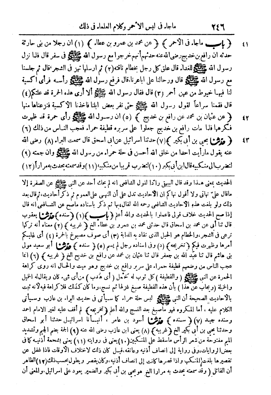 (باب ما جاء في الأحمر) (عن محمد بن عمرو بن عطاء) (1) أن رجلا من بني حارثة حدثه أن رافع بن خديج رضي الله عنه حدثهم أنهم خرجوا مع رسول الله صلى الله عليه وسلم في سفر قال فلما نزل رسول الله صلى الله عليه وسلم للغداء قال علق كل رجل بخطام ناقته (2) ثم أرسلها تهز في الشجر، قال ثم جلسنا مع رسول الله صلى الله عليه وسلم قال ورحالنا على أباعرنا قال فرفع رسول الله صلى الله عليه وسلم رأسه فرأى أكسية لنا فيها خيوط من عهن أحمر (3) قال فقال رسول الله صلى الله عليه وسلم ألا أرى هذه الحمرة قد علتكم (4) قال فقمنا سراعاً لقول رسول الله صلى الله عليه وسلم حتى نفر بعض إبلنا فأخذنا الأكسية فنزعناها منها (عن عثمان بن محمد عن رافع بن خديج) (5) أن رسول الله صلى الله عليه وسلم رأى حمرة قد ظهرت فكرهها فلما مات رافع بن خديج جعلوا على سريره قطيفة حمراء فعجب الناس من ذلك (6) (حدثنا يحيى بن أبي بكير) (7) حدثنا إسرائيل عن أبي إسحق قال سمعت البراء (8) رضى الله عنه يقول ما رأيت أحدا من خلق الله أحسن في حلة حمراء من رسول الله صلى الله عليه وسلم وأن جمته (9) لتضرب إلى منكبيه قال ابن أبي بكير (10) لتضرب قريبا من منكبيه (11) وقد سمعته يحدث به مرارا (12)