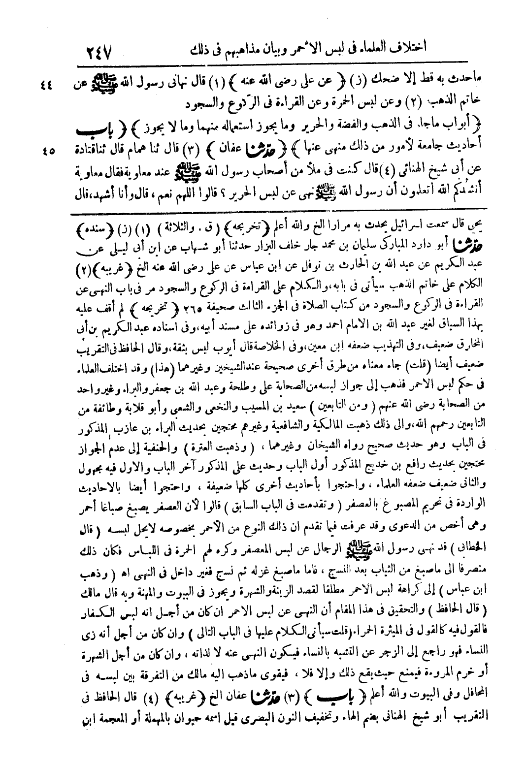 يحيى قال سمعت إسرائيل يحدث به مرارا الخ والله أعلم (تخريجه) (ق. والثلاثة) (1) (ز) (سنده) حدثنا أبو داود المباركي سليمان بن محمد جار خلف البزار حدثنا أبو شهاب عن ابن أبي ليلى عن عبد الكريم عن عبد الله بن الحارث بن نوفل عن ابن عياش عن علي رضي الله عنه الخ (غريبه) (2) الكلام على خاتم الذهب سيأتي في بابه، والكلام على القراءة في الركوع والسجود مر في باب النهي عن القراءة في الركوع والسجود من كتاب الصلاة في الجزء الثالث صحيفة (265) (تخريجه) لم أقف عليه بهذا السياق لغير عبد الله بن الأمام أحمد وهو في زوائده على مسند أبيه، وفي إسناده عبد الكريم بن أبي المخارق ضعيف، وفي التهذيب ضعفه ابن معين، وفي الخلاصة قال أيوب ليس بثقة، وقال الحافظ في التقريب ضعيف أيضا (قلت) جاء معناه من طرق أخرى صحيحة عند الشيخين وغيرهما (هذا) وقد اختلف العلماء في حكم لبس الأحمر فذهب إلى جواز لبسه من الصحابة على وطلحة وعبد الله بن جعفر والبراء وغير واحد من الصحابة رضي الله عنهم (ومن التابعين) سعيد بن المسيب والنخعي والشعبي وأبو قلابة وطائفة من التابعين رحمهم الله، وإلى ذلك ذهبت المالكية والشافعية وغيرهم محتجين بحديث البراء بن عازب المذكور في الباب وهو حديث صحيح رواه الشيخان وغيرهما، (وذهبت العترة) والحنفية إلى عدم الجواز محتجين بحديث رافع بن خديج المذكور أول الباب وحديث علي المذكور آخر الباب والأول فيه مجهول والثاني ضعيف ضعفه العلماء، واحتجوا بأحاديث أخرى كلها ضعيفة، واحتجوا أيضا بالأحاديث الواردة في تحريم المصبوغ بالعصفر (وتقدمت في الباب السابق) قالوا لأن العصفر يصبغ صباغا أحمر وهي أخص من الدعوى وقد عرفت فيما تقدم أن ذلك النوع من الأحمر بخصوصه لا يحل لبسه (قال الخطابي) قد نهى رسول الله صلى الله عليه وسلم الرجال عن لبس المعصفر وكره لحم الحمرة في اللباس فكان ذلك منصرفا إلى ما صبغ من الثياب بعد النسج، فأما ما صبغ غزله ثم نسج فغير داخل في النهي اهـ (وذهب ابن عباس) إلى كراهة لبس الأحمر مطلقا لقصد الزينة والشهرة ويجوز في البيوت والمهنة وبه قال مالك (قال الحافظ) والتحقيق في هذا المقام أن النهي عن لبس الأحمر إن كان من أجل أنه لبس الكفار فالقول فيه كالقول في الميثرة الحمرا. (قلت سيأتي الكلام عليها في الباب التالي) وإن كان من أجل أنه زي النساء فهو راجع إلى الزجر عن التشبيه بالنساء فيكون النهي عن لا لذاته، وإن كان من الشهرة أو خرم المروءة فيمنع حيث يقع ذلك وإلا فلا، فيقوى ما ذهب إليه مالك من التفرقة بين لبسه في المحافل وفي البيوت والله أعلم (باب) (3) حدثنا عفان الخ (غريبه) (4) قال الحافظ في التقريب أبو شيخ الهناني بضم الهاء وتخفيف النون البصري قيل اسمه حيوان بالمهملة أو المعجمة ابن