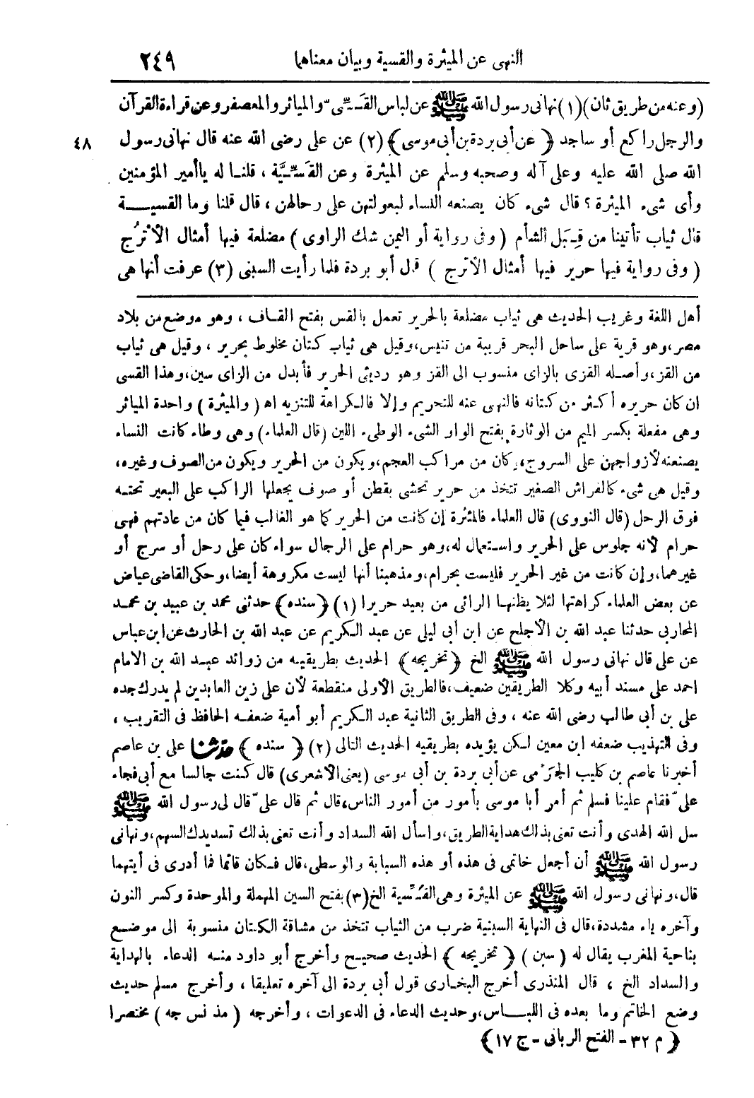 (وعنه من طريق ثان) (1) نهاني رسول الله صلى الله عليه وسلم عن لباس القسي والمياثر والمعصفر وعن قراءة القرآن والرجل راكع أو ساجد (عن أبي بردة بن أبي موسى) (2) عن علي رضي الله عنه قال نهاني رسول الله صلى الله عليه وعلى آله وصحبه وسلم عن الميثرة وعن القسية، قلنا له يا أمير المؤمنين وأي شيء الميثرة؟ قال شيء كان يصنعه النساء لبعولتهن على رحالهن، قال قلنا وما القسية قال ثياب تأتينا من قبل الشام (وفي رواية أو اليمن شك الراوي) مضلعة فيها أمثال الأترج (وفي رواية فيها حرير فيها أمثال الأترج) قال أبو بردة فلما رأيت السبني (3) عرفت أنها هي