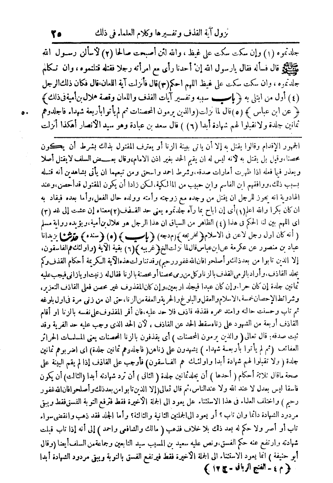الجمهور الإقدام وقالوا يقتل بة الا ان ياتى ببينة الزنا او يعترف المقتول بذلك بشرط ان يكون محصنا وقيل بل يقتل بة لانة ليس لة ان يقيم الحد بغير اذن الامام وقال بعض السلف لا يقتل اصلا ويعذر فيما فعلة اذا ظهرت امارات صدقة وشرط حمد واسخق ومن تبعهما ان ياتى بشاهدين انة قتلة بسبب ذلك ووافقهم ابن القاسم وابن حبيب من المالكية لكن زادا ان يكون المقتول قد احصن وعند الهادوية انة يجوز للرجل ان يقتل من وجدة مع زوجتة وامتة وولدة حال الفعل واما بعدة فيقاد بة ان كان بكرا واللة اعلم (1) اى ان اباح بما راه جلدتموة يعنى حد القذف (2) معناه ان عشت الى غد (3) اى اللهم بين لنا الحكم فى هذا (4) الظاهر من السياق ان هذا الرجل هو هلال بن امية ويؤيدة رواية مسلم (انة كان اول رجل لاعن فى الاسلام) (تخريجة) (م دجة) (باب) (5) (سندة) حدثنا يزيد انا عباد بن منصور عن عكرمة عن ابن العباس قال لما نزلت الخ (غريبة) (6) بقية الاية (اولائك هم الفاسقون الا الذين تابوا من ذلك واصلحوا فان اللة غفور رحيم) وقد تناولت هذة الاية الكريمة احكام القذف وكم يجلد القاذف واراد بالرمى القذف بالزنا وكل من رمى محصنا او محصنة فقال لة زنيت او يازانى فيجب علية ثمانين جلدة ان كان حر وان كان عبدا فيلجلد اربعين وان كان المقذوف غير محصن فعلى القاذف التعزيز وشرائط الاحصان خمسة الاسلام والعقل والبلوغ والحرية والعفة من الزنا حتى ان من زنى مرة فى اول بلوغة ثم تاب وحسنت حالتة وامتد عمره فقذفة قاذف لان الحد الذى وجب علية هو حد الفرية وقد ثبت صدقة قال تعالى (والذين يرمون المحصنات) اى يقذفون بالزنا المحصنات يعنى المسلمات الحرائر العفائف (ثم لم ياتوا باربعة شهداء) يشهدون على زناهن (فاجلدوهم ثمانين جلدة) اى اضربوهم ثمانين جلدة (ولا تقبلوا لهم شهادة ابدا واولئك هم الفاسقون) فأوجب على القاذف اذا لم يقيم البينو على صحة ما قال ثلاثة احكام (احدها) ان يجلد ثمانين جلدة (الثانى) ان ترد شهادتة ابدا (الثالث) ان يكون فاسقا ليس بعدل لا عند اللة ولا عند الناس ثم قال تعالى (الا الذين تابوا من بعد ذلك واصلحوا فان اللة غفور رحيم) واختلف العلماء فى هذا الاستثناء هل يعود الى الجملة الاخيرة فقط فترفع التوبة الفسق فقط ويبقى مردود الشهادة دائما وان تاب؟ او يعود الى الجملتين الثانية والثالثة؟ واما الجلد فقط فقد ذهب وانقضى سواء تاب او اصر ولا حكم لة بعد ذلك بلا خلاف فذهب (مالك والشافعى واحمد) الى انة اذا تاب قبلت شهادتة وارتفع عنة حكم الفسق ونص علية بن المسيب سيد التابعين وجماعة من السلف ايضا (وقال ابو حنيفة) انما يعود الاستثناء الى الجملة الاخيرة فقط فيرتفع الفسق بالتوبة ويبقى الشهادة أبدًا
