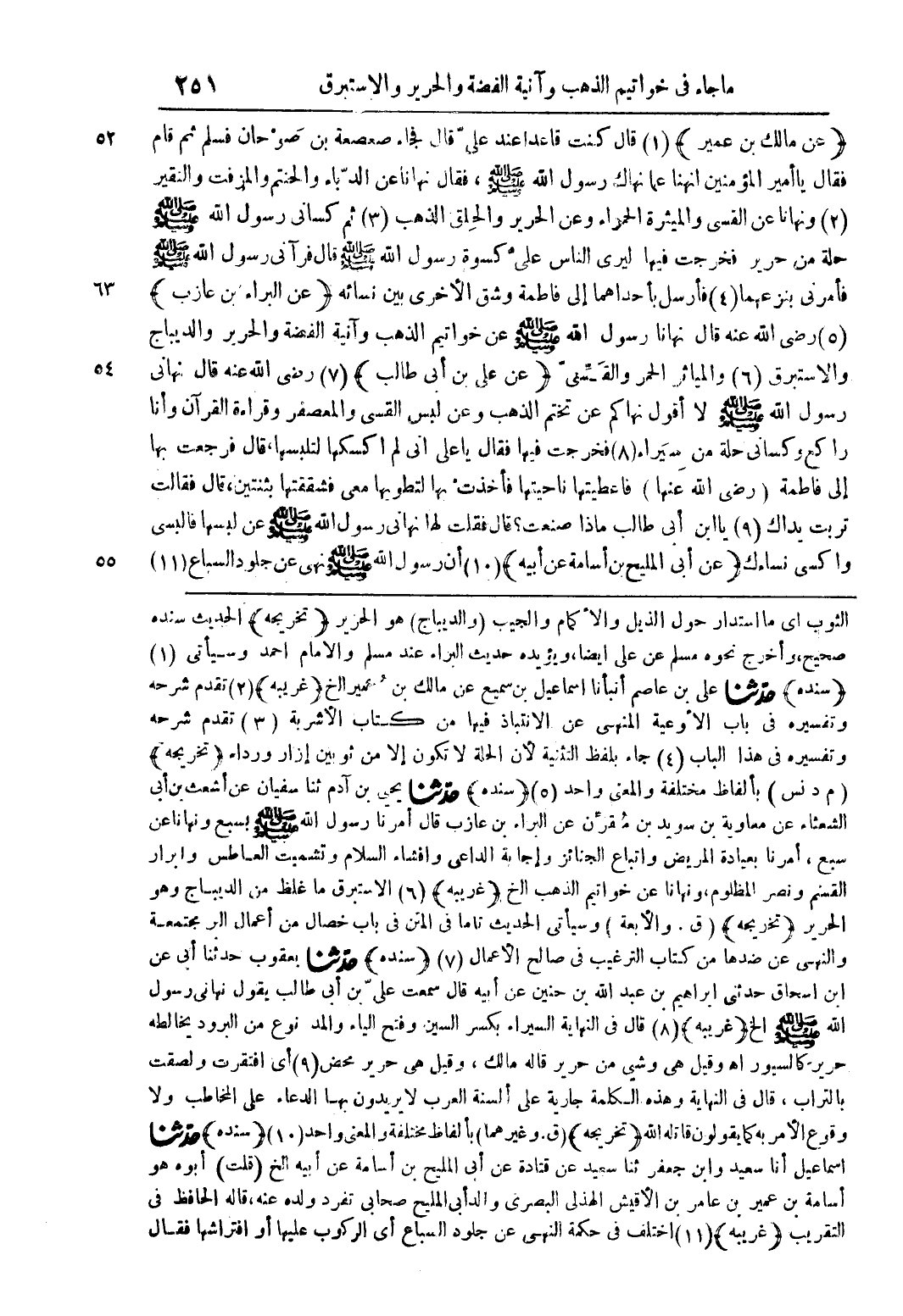 (عن مالك بن عمير) (1) قال كنت قاعدا عند علي قال فجاء صعصعة بن صوحان فسلم ثم قال فقال يا أمير المؤمنين انهنا عما نهاك رسول الله صلى الله عليه وسل، فقال نهانا عن الدباء والختم والمزفت والنقير (2) ونهانا عن القسي والميثرة والحمراء وعن الحرير والحلق الذهب (3) ثم كساني رسول الله صلى الله عليه وسلم حلة من حرير فخرجت فيها ليرى الناس على كسوة رسول الله صلى الله عليه وسلم قال فرآني رسول الله صلى الله عليه وسلم فأمرني بنزعهما (4) فأرسل بأحداهما إلى فاطمة وشق الأخرى بين نسائه (عن البراء بن عازب) (5) رضى الله عنه قال نهانا رسول الله صلى الله عليه وسلم عن خواتيم الذهب وآنية الفضة والحرير والديباج والاستبرق (6) والمياثر الحمر والقسى (عن علي بن أبي طالب) (7) رضي الله عنه قال نهاني رسول الله صلى الله عليه وسلم لا أقول نهاكم عن تختم الذهب وعن لبس القسى والمعصفر وقراءة القرآن وأنا راكع وكساني حلة من صيراء (8) فخرجت فيها فقال يا علي إني لم أكسكها لتلبسها، قال فرجعت بها إلى فاطمة (رضي الله عنها) فأعطيتها ناحيتها فأخذت بها لتطويها معي فشققتها بثنتين، قال فقالت تربت يداك (9) يا ابن أبي طالب ماذا صنعت؟ قال فقلت لها نهاني رسول الله صلى الله عليه وسلم عن لبسها فالبسي واكسي نساءك (عن أبي المليح بن أسامة عن أبيه) (10) أن رسول الله صلى الله عليه وسلم ونهى عن جلود السباع (11)