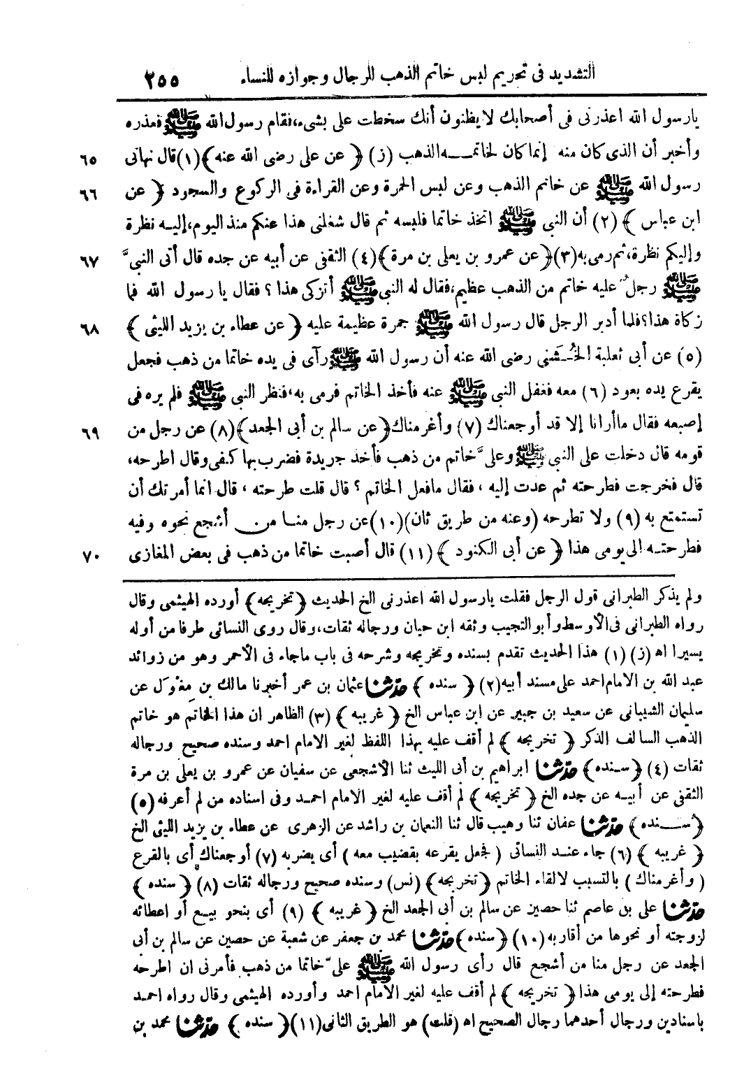 يا رسول الله اعذرني في أصحابك لا يظنون أنك سخطت على بشيء، فقام رسول الله صلى الله عليه وسلم فعذره وأخبر أن الذي كان منه إنما كان لخاتمه الذهب (ز) (عن علي رضي الله عنه) (1) قال نهاني رسول الله صلى الله عليه وسلم عن خاتم الذهب وعن لبس الحمرة وعن القراءة في الركوع والسجود (عن ابن عباس) (2) أن النبي صلى الله عليه وسلم اتخذ خاتما فلبسه ثم قال شغلني هذا عنكم منذ اليوم، إليه نظرة وإليكم نظرة، ثم رمى به (3) (عن عمرو بن يعلى بن مرة) (4) الثقفي عن أبيه عن جده قال أتى النبي صلى الله عليه وسلم رجل عليه خاتم من الذهب عظيم، فقال له النبي صلى الله عليه وسلم أتزكى هذا؟ فقال يا رسول الله فما زكاة هذا؟ فلما أدبر الرجل قال رسول الله صلى الله عليه وسلم جمرة عظيمة عليه (عن عطاء بن يزيد الليثي) (5) عن أبي ثعلبة الخشني رضي الله عنه أن رسول الله صلى الله عليه وسلم رآى في يده خاتما من ذهب فجعل يقرع يده بعود (6) معه فغفل النبي صلى الله عليه وسلم عنه فأخذ الخاتم فرمى به، فنظر النبي صلى الله عليه وسلم فلم يره في إصبعه فقال ما أرانا إلا قد أوجعناك (7) وأغرمناك (عن سالم بن أبي الجعد) (8) عن رجل من قومه قال دخلت على النبي صلى الله عليه وسلم وعلى خاتم من ذهب فأخذ جريدة فضرب بها كفى وقال أطرحه، قال فخرجت فطرحته ثم عدت إليه، فقال ما فعل الخاتم؟ قال قلت طرحته، قال إنما أمرتك أن تستمتع به (9) ولا تطرحه (وعنه من طريق ثان) (10) عن رجل منا من أشجع نحوه وفيه فطرحته إلى يومي هذا (عن أبي الكنود) (11) قال أصبت خاتما من ذهب في بعض المغازي