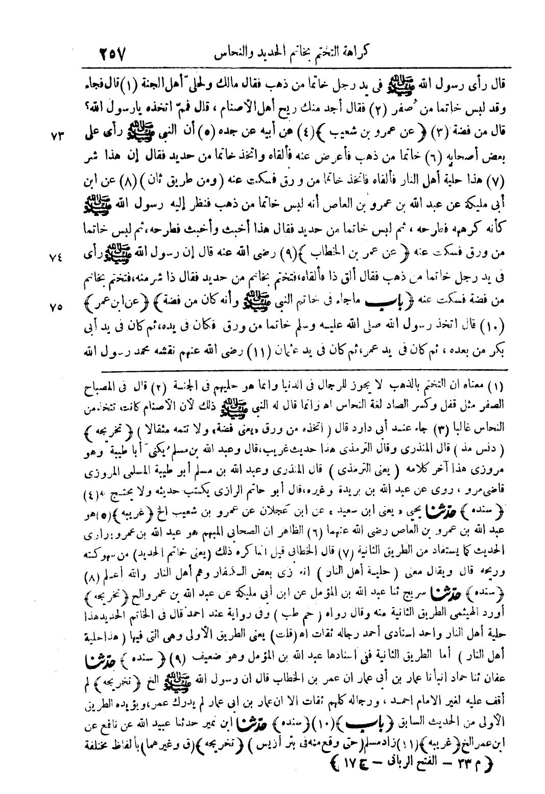 (1) معناه أن التختم بالذهب لا يجوز للرجال في الدنيا وإنما هو حليهم في الجنة (2) قال في المصباح الصفر مثل قفل وكسر الصاد لغة النحاس اهـ وإنما قال له النبي صلى الله عليه وسلم ذلك لأن الأصنام كانت تتخذ من النحاس غالبا (3) جاء عند أبي داود قال (اتخذه من ورق "يعني فضة" ولا تتمه مثقالا) (تخريجه) (دنس مذ) قال المنذري وقال الترمذي هذا حديث غريب، قال وعبد الله بن مسلم يكنى أبا طيبة وهو مروذي هذا آخر كلامه (يعني الترمذي) قال المنذري وعبد الله بن مسلم أبو طيبة المسلمي المروزي قاضي مرو، روى عن عبد الله بن بريدة وغيره، قال أبو حاتم الرازي يكتب حديثه ولا يحتج به (4) (سنده) حدّثنا يحيى "يعني ابن سعيد" عن ابن عجلان عن عمرو بن شعيب الخ (غريبه) (5) هو عبد الله بن عمرو بن العاص رضي الله عنهما (6) الظاهر أن الصحابي المبهم هو عبد الله بن عمرو ورازي الحديث كما يستفاد من الطريق الثانية (7) قال الخطابي قيل لنا كره ذلك (يعني خاتم الحديد) من سهوكته وريحه قال ويقال معنى (حلية أهل النار) أنه زي بعض الكفار وهم أهل النار والله أعلم (8) (سنده) حدّثنا سريج ثنا عبد الله بن المؤمل عن ابن أبي مليكة عن عبد الله بن عمرو الخ (تخريجه) أورد الهيثمي الطريق الثانية منه وقال رواه (حم طب) وفي رواية عند أحمد قال في الخاتم الحديد هذا حلية أهل النار وأحد إسنادي أحمد رجاله ثقات اهـ (قلت) يعني الطريق الأولى وهي التي فيها (هذا حلية أهل النار) أما الطريق الثانية ففي إسنادها عبد الله بن المؤمل وهو ضعيف (9) (سنده) حدّثنا عفان ثنا حماد أنبأنا عمار بن أبي عمار أن عمر بن الخطاب قال أن رسول الله صلى الله عليه وسلم الخ (تخريجه) لم أقف عليه لغير الإمام أحمد، ورجاله كلهم ثقات إلا أن عمار بن أبي عمار لم يدرك عمر، ويؤيده الطريق الأولى من الحديث السابق (باب) (10) (سنده) حدّثنا ابن نمير حدثنا عبيد الله عن نافع عن ابن عمر الخ (غريبه) (11) زاد مسلم (حتى وقع منه في بئر أزيس) (تخريجه) (ق وغيرهما) بألفاظ مختلفة