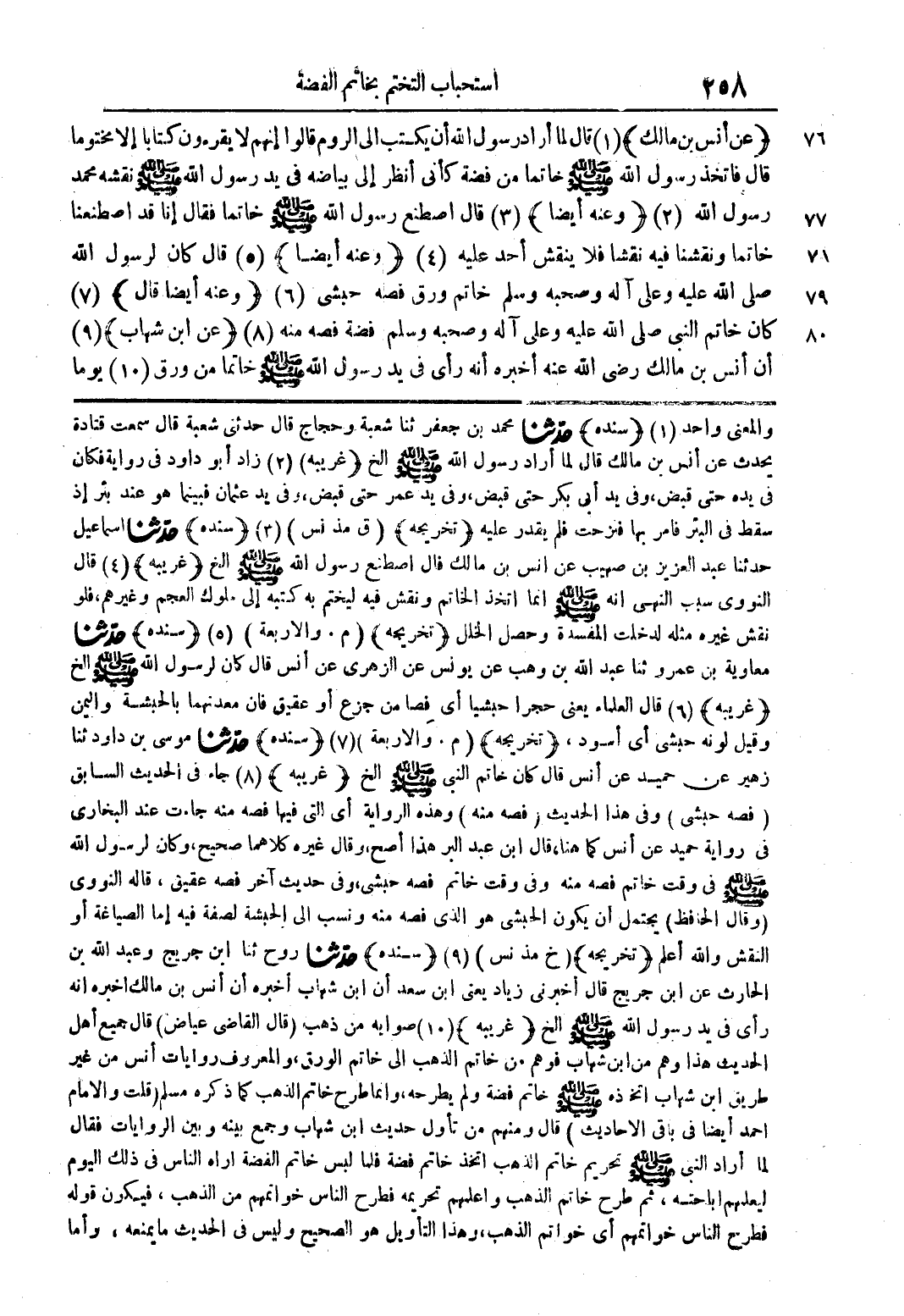 (عن أنس بن مالك) (1) قال لما أراد رسول الله أن يكتب إلى الروم قالوا إنهم لا يقرءون كتابا إلا مختوما قال فاتخذ رسول الله صلى الله عليه وسلم خاتما من فضة كأني أنظر إلى بياضه في يد رسول الله صلى الله عليه وسلم نقشه محمد رسول الله (2) (وعنه أيضا) (3) قال اصطنع رسول الله صلى الله عليه وسلم خاتما فقال إنا قد اصطنعنا خاتما ونقشنا فيه نقشا فلا ينقش أحد عليه (4) (وعنه أيضا) (5) قال كان لرسول الله صلى الله عليه وسلم وعلى آله وصحبه وسلم خاتم ورق فصه حبشي (6) وعنه أيضا قال) (7) كان خاتم النبي صلى الله عليه وسلم فضة فصه منه (8) (عن ابن شهاب) (9) أن أنس بن مالك رضي الله عنه أخبره أنه رأى في يد رسول الله صلى الله عليه وسلم خاتما من ورق (10) يوما