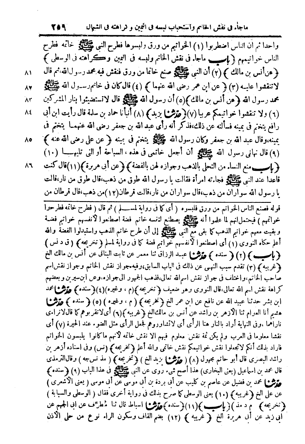 قوله فصنع الناس الخواتم من ورق فلبسوه (أي كما في رواية لمسلم) ثم قال (فطرح خاتمه فطرحوا خواتمهم) فيحتمل أنهم لما علموا أنه صلى الله عليه وسلم يصطنع لنفسه خاتم فضة اصطنعوا لأنفسهم خواتيم فضة وبقيت معهم خواتيم الذهب كما بقى مع النبي صلى الله عليه وسلم إلى أن طرح خاتم الذهب واستبدلوا الفضة والله أعلم حكاه النووي (1) أي اصطنعوا لأنفسهم خواتيم فضة كما في رواية لمسلم (تخريجه) (ق د نس) (باب) (2) (سنده) حدّثنا عبد الرزاق ثنا معمر عن ثابت البناني عن أنس بن مالك الخ (غريبه) (3) تقدم سبب النهي عن ذلك في الباب السابق، وفيه جواز نقش الخاتم وجواز نقش اسم صاحب الخاتم، واختلف في جواز نقش اسم الله تعالى، فذهب الجمهور في جوازه وعن ابن سيرين وبعضهم كراهة نقش اسم الله تعالى، قال النووي وهو ضعيف (تخريجه) (م، وغيره) (4) (سنده) حدّثنا محمد ابن بشر حدثنا عبيد الله عن نافع عن ابن عمر الخ (تخريجه) (م، وغيره) (5) (سنده) حدّثنا هشيم أنا العوام ثنا الأزهر بن راشد عن أنس بن مالك الخ (غريبه) (6) أي لا تقربوهم كما قال لا تراءى ناراهما، وفي النهاية أراد بالنار هنا الرأي أي لا تشاوروهم فجعل الرأي مثل الضوء عند الحيرة (7) أي نقشا معلوما في العرب ولم يكن ثمة نقش معلوم فيهم إلا نقش خاتمة لأنهم ما كانوا يلبسون الخواتم فأراد بذلك أنكم لا تجعلوا نقش خواتيمكم نقش خاتمي والله أعلم (تخريجه) (نس) وفي إسناده أزهر بن راشد البصري قال أبو حاتم مجهول (8) (حدثنا يزيد الخ) (تخريجه) (مذ نس جه) وقال الترمذي قال محمد بن إسماعيل (يعني البخاري) هذا أصح شيء روى عن النبي صلى الله عليه وسلم في هذا الباب (9) (سنده) حدّثنا محمد بن فضيل عن عاصم بن كليب عن أبي بردة بن أبي موسى عن أبي موسى (يعني الأشعري) عن على الخ (غريبه) (10) يعني الوسطي كما صرح بذلك في رواية أخرى فقال (الوسطى والسبابة) (تخريجه) م د مذ) (باب) (11) (سنده) حدّثنا إسباط قال ثنا مطرف عن أبي الجهم عن أبي زيد عن أبي هريرة الخ (غريبه) (12) بضم القاف وسكون الراء نوع من حلي الأذن