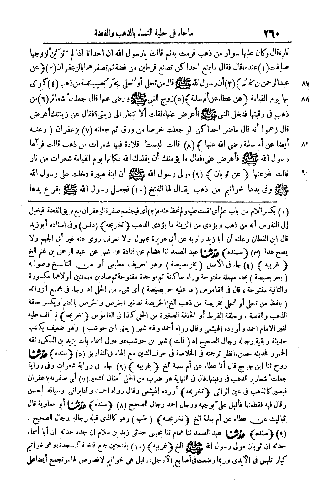 (1) بكسر اللام من باب علم أي ثقلت عليه ولم تحظ عنده (2) أي فيجتمع صفرة الزعفران مع بريق الفضة فيخيل إلى النفوس أنه من ذهب ويؤدي من الزينة ما يؤدي الذهب (تخريجه) (دنس) وفي إسناده أبو زيد قال ابن القطان وعلته أن أبا زيد راوية عن أبي هريرة مجهول ولا نعرف روى عنه غير أبي الجهم ولا يصح هذا (3) (سنده) حدّثنا عبد الصمد ثنا هشام عن قتادة عن شهر عن عبد الرحمن بن غنم الخ (غريبه) (4) جاء في الأصل (بخز بصيصة) وهو تحريف مطبعي أو من الناسخ وصوابه (بحر بصيصة) بحاء مهملة مفتوحة وراء ساكنة ثم موحدة مفتوحة ثم صادين مهملتين أولاهما مكسورة والثانية مفتوحة، قال في القاموس (ما عليه حر بصيصة) أي شيء من الحلى اهـ وجاء في مجمع الزوائد (بلفظ من تحلى أو حلى بخريصة من ذهب الخ) الخريصة تصغير الخرص والخرص بالضم ويكسر حلقة الذهب والفضة، وحلقة القرط أو الحلقة الصغيرة من الحلى كذا في القاموس (تخريجه) لم أقف عليه لغير الإمام أحمد وأورده الهيثمي وقال رواه أحمد وفيه شهر (يعني ابن حوشب) وهو ضعيف يكتب حديثه وبقية رجاله رجال الصحيح اهـ (قلت) شهر من حوشب هو مولى أسماء بنت يزيد بن السكن وثقه الجهور فحديثه حسن، انظر ترجمته في الخلاصة في حرف الشين مع الهاء في التفاريق (5) (سنده) حدّثنا روح ثنا ابن جريج قال أنا عطاء عن أم سلمة الخ (غريبه) (6) جاء في رواية شعرات وفي رواية جعلت شعارير الذهب في رقبتها، قال في النهاية هو ضرب من الحلى أمثال الشعير (7) أي صفرته بزعفران فيصير كالذهب في عين الرائي (تخريجه) أورده الهيثمي وقال رواه أحمد والطبراني وسياقه أحسن وقال فيه فقطعتها فأقبل على بوجهه ورجال أحمد رجال الصحيح (8) (سنده) حدثنا أبو معاوية قال ثناليث عن عطاء عن أم سلمة الخ (تخريجه) (طب) وهو كالذي قبله رجاله رجال الصحيح. (9) (سنده) حدّثنا عبد الصمد ثنا همام ثنا يحيى حدثني زيد بن سلام أن جده حدثه أن أبا أسماء حدثه أن ثوبان مولى رسول الله صلى الله عليه وسلم الخ (غريبه) (10) بفتحتين جمع فتحة كسجدة، وهي خواتيم كبار تلبس في الأيدي وربما وضعت في أصابع الأرجل، قيل هي خواتيم لافصوص لها، وتجمع أيضا على