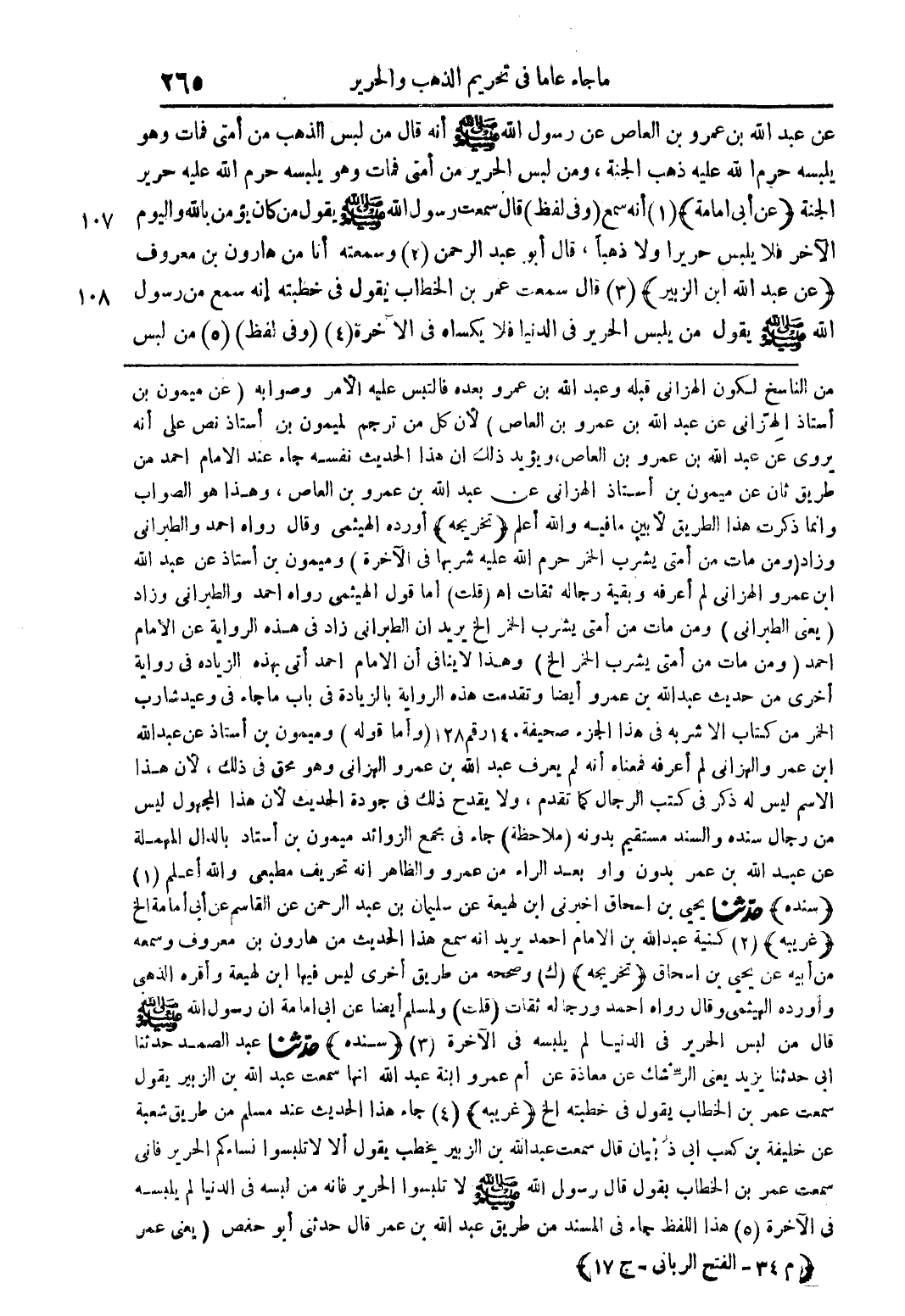 عن عبد الله بن عمرو بن العاص عن رسول الله صلى الله عليه وسلم أنه قال من لبس الذهب من أمتي فمات وهو يلبسه حرام الله عليه ذهب الجنة، ومن لبس الحرير من أمتي فمات وهو يلبسه حرم الله عليه حرير الجنة (عن أبي امامة) (1) أنه سمع (وفي لفظ) قال سمعت رسول الله صلى الله عليه وسلم يقول من كان يؤمن بالله واليوم الآخر فلا يلبس حريرا ولا ذهباً، قال أبو عبد الرحمن (2) وسمعته أنا من هارون بن معروف (عن عبد الله ابن الزبير) (3) قال سمعت عمر بن الخطاب يقول في خطبته إنه سمع من رسول الله صلى الله عليه وسلم يقول من يلبس الحرير في الدنيا فلا يكساه في الآخرة (4) (وفي لفظ) (5) من لبس
