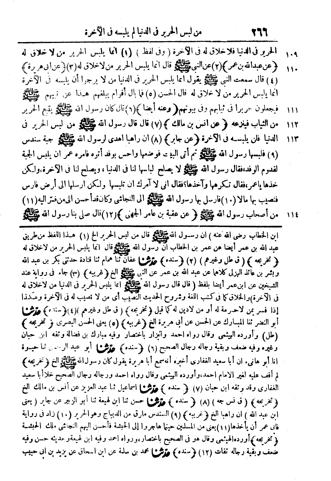 الحرير في الدنيا فلا خلاق له في الآخرة (وفي لفظ) (1) إنما يلبس الحرير من لا خلاق له (عن عبد الله بن عمر) (2) عن النبي صلى الله عليه وسلم قال إنما يلبس الحرير من لا خلاق له (3) (عن أبي هريرة) (4) قال سمعت النبي صلى الله عليه وسلم يقول إنما يلبس الحرير في الدنيا من لا يرجوا أن يلبسه في الآخرة إنما يلبس الحرير من لا خلاق له قال الحسن (5) فما بال أقوام يبلغهم هذا عن نبيهم صلى الله عليه وسلم فيجعلون حريرا في ثيابهم وفي بيوتهم (وعنه أيضا) (6) قال كان رسول الله صلى الله عليه وسلم يتبع الحرير من الثياب فينزعه (عن أنس بن مالك) (7) قال قال رسول الله صلى الله عليه وسلم من لبس الحرير في الدنيا فلن يلبسه في الآخرة (عن جابر) (8) أن راهبا أهدي لرسول الله صلى الله عليه وسلم جبة سندس (9) فلبسها رسول الله صلى الله عليه وسلم ثم أتى البيت فوضعها واحس بوفد أتوه فامره عمر أن يلبس الجبة لقدوم الوفد، فقال رسول الله صلى الله عليه وسلم لا يصلح لباسها لنا في الدنيا، ويصلح لنا في الآخرة، ولكن خذها يا عمر، فقال تكرهها وآخذها؟ فقال أني لا آمرك أن تلبسها ولكن أرسلها إلى أرض فارس فتصيب بها مالا (10) فارسل بها رسول الله صلى الله عليه وسلم إلى النجاشي وكان قد أحسن إلى من فرّ إليه (11) من أصحاب رسول الله صلى الله عليه وسلم (عن عقبة بن عامر الجهني) (12) قال صلى بنا رسول الله صلى الله عليه وسلم