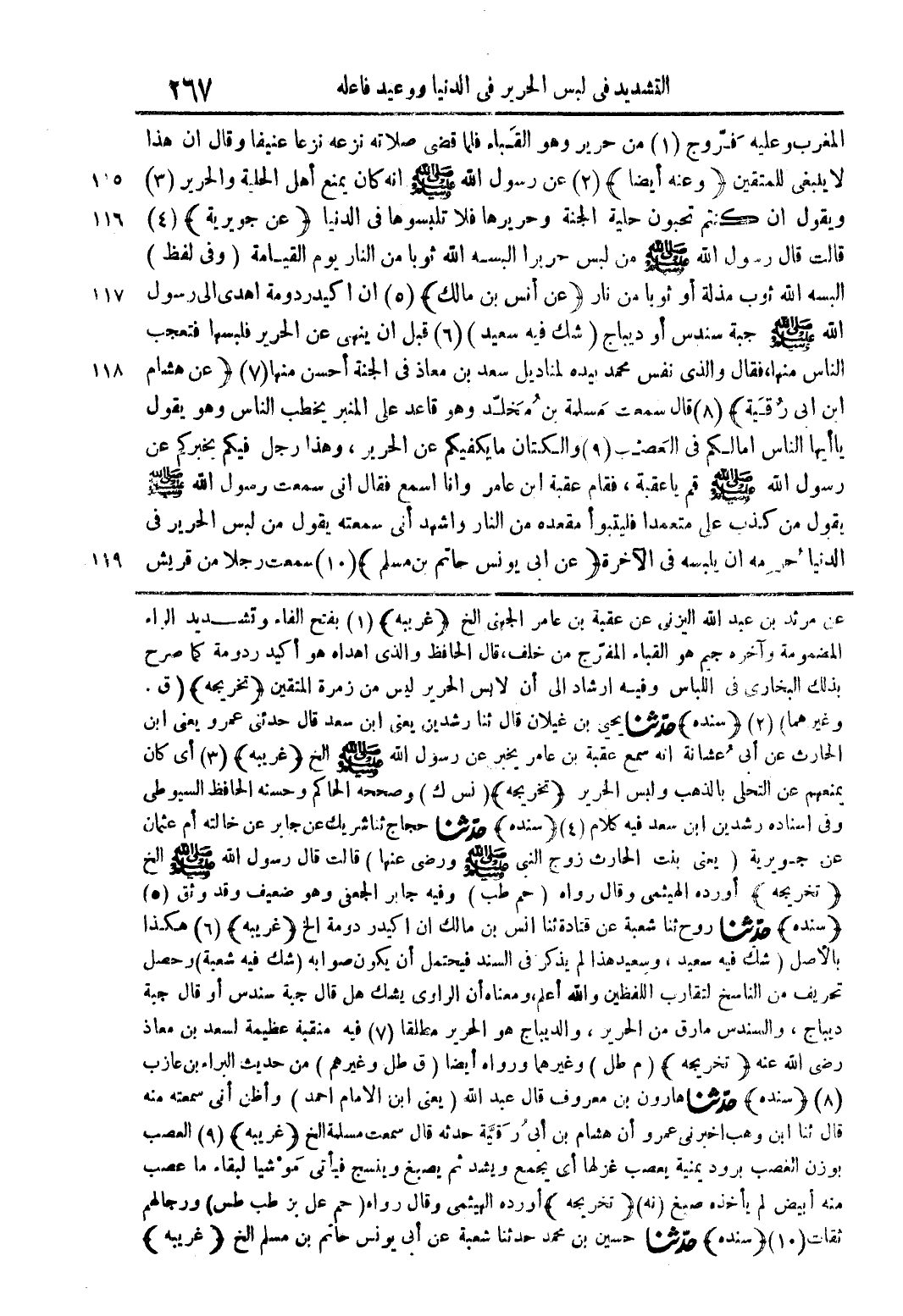 عن مرثد بن عبد الله اليزني عن عقبة بن عامر الجهني الخ (غريبه) (1) بفتح الفاء وتشديد الراء المضمومة وآخره جيم هو القباء المفرّج من خلف، قال الحافظ والذي أهداه هو أكيد ردومة كما صرح بذلك البخاري في اللباس وفيه أرشاد إلى أن لابس الحرير ليس من زمرة المتقين (تخريجه) (ق. وغيرهما) (2) (سنده) حدّثنا يحيى بن غيلان قال ثنا رشدين يعني ابن سعد قال حدثني عمرو يعني أن الحارث عن أبي عشانة أنه سمع عقبة بن عامر يخبر عن رسول الله صلى الله عليه وسلم الخ (غريبه) (3) أي كان يمنعهم عن التحلي بالذهب ولبس الحرير (تخريجه) (نس ك) وصححه الحاكم وحسنه الحافظ السيوطي وفي إسناده رشدين ابن سعد فيه كلام (4) (سنده) حدّثنا حجاج ثنا شريك عن جابر عن خالته أم عثمان عن جويرية (يعني بنت الحارث زوج النبي صلى الله عليه وسلم ورضي عنها) قالت قال رسول الله صلى الله عليه وسلم الخ (تخريجه) أورده الهيثمي وقال رواه (حم طب) وفيه جابر الجعفي وهو ضعيف وقد وئق (5) (سنده) حدّثنا روح ثنا شعبة عن قتادة ثنا أنس بن مالك أن أكيدر دومة الخ (غريبه) (6) هكذا بالأصل (شك فيه سعيد، وسعيد هذا لم يذكر في السند فيحتمل أن يكون صوابه (شك فيه شعبة) وحصل تحريف من الناسخ لتقارب اللفظين والله أعلم، ومعناه أن الراوي يشك هل قال جبة سندس أو قال بة ديباج، والسندس مارق من الحرير، والديباج هو الحرير مطلقا (7) فيه منقبة عظيمة لسعد بن معاذ رضي الله عنه (تخريجه) (م طل) وغيرهما ورواه أيضا (ق طل وغيرهم) من حديث البراء بن عازب (8) (ٍنده) حدّثنا هارون بن معروف قال عبد الله (يعني ابن الإمام أحمد) وأظن أني سمعته منه قال ثنا ابن وهب أخبرني عمرو أن هشام بن أبي رقيَّة حدثه قال سمعت مسلمة الخ (غريبه) (9) العصب بوزن العصب برود يمنية يعسب غزلها أي يجمع ويشد ثم يصبغ وينسج فيأتي مؤشيا لبقاء ما عصب منه أبيض لم يأخذ صبغ (نه) (تخريجه) أورده الهيثمي وقال رواه (حم عل بز طب طس) ورجالهم ثقات (10) (سنده) حدّثنا حسين بن محمد حدثنا شعبة عن أبي يونس حاتم بن مسلم الخ (غريبه)