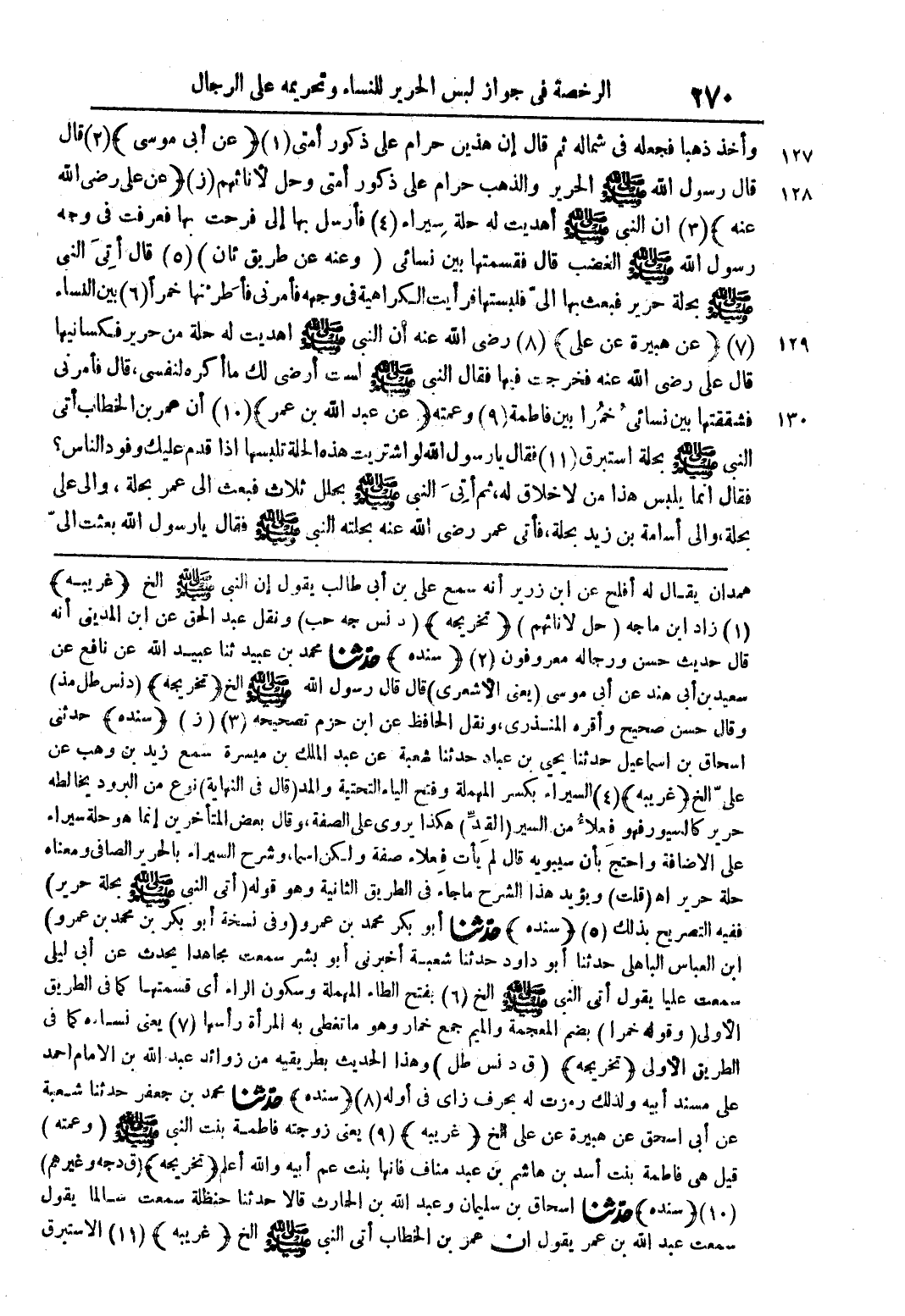 وأخذ ذهبا فجعله شماله ثم قال إن هذين حرام على ذكور أمتي (1) (عن أبي موسى) (2) قال رسول الله صلى الله عليه وسلم الحرير والذهب حرام على ذكور أمتي وحل لإناثهم (ز) (عن على رضي الله عنه) (3) أن النبي صلى الله عليه وسلم أهديت له حلة سيراء (4) فأرسل بها إلى فرحت بها فعرفت في وجه رسول الله صلى الله عليه وسلم اغضب قال فقسمتها بين نسائي (وعنه عن طريق ثان) (5) قال أتى النبي صلى الله عليه وسلم بحلة حرير فبعث بها إلىّ فلبستها فرأيت الكراهية في وجهه فأمرني فأطرتها خمرا (6) بين النساء (7) (عن هبيرى عن على) (8) رضي الله عنه أن النبي صلى الله عليه وسلم أهديت له حلة من حرير فكسانيها قال على رضي الله عنه فخرجت فيها فقال النبي صلى الله عليه وسلم لست أرضي لك ما أكره لنفسي، قال فأمرني فشققتها بين نسائي خمرا بين فاطمة (9) وعمته (عن عبد الله بن عمر) (10) أن عمر بن الخطاب أتى النبي صلى الله عليه وسلم بحلة استبرق (11) فقال يا رسول الله لو اشتريت هذه الحلة تلبسها إذا قدم عليك وفود الناس؟ فقال إنما يلبس هذا من لا خلاق له، ثم أتى النبي صلى الله عليه وسلم بحلل ثلاث فبعث إلى عمر بحلة، وإلى على بحلة، وإلى أسامة بن زيد بحلة، فأتى عمر رضي الله عنه بحلته النبي صلى الله عليه وسلم فقال يا رسول الله بعثت إلىّ