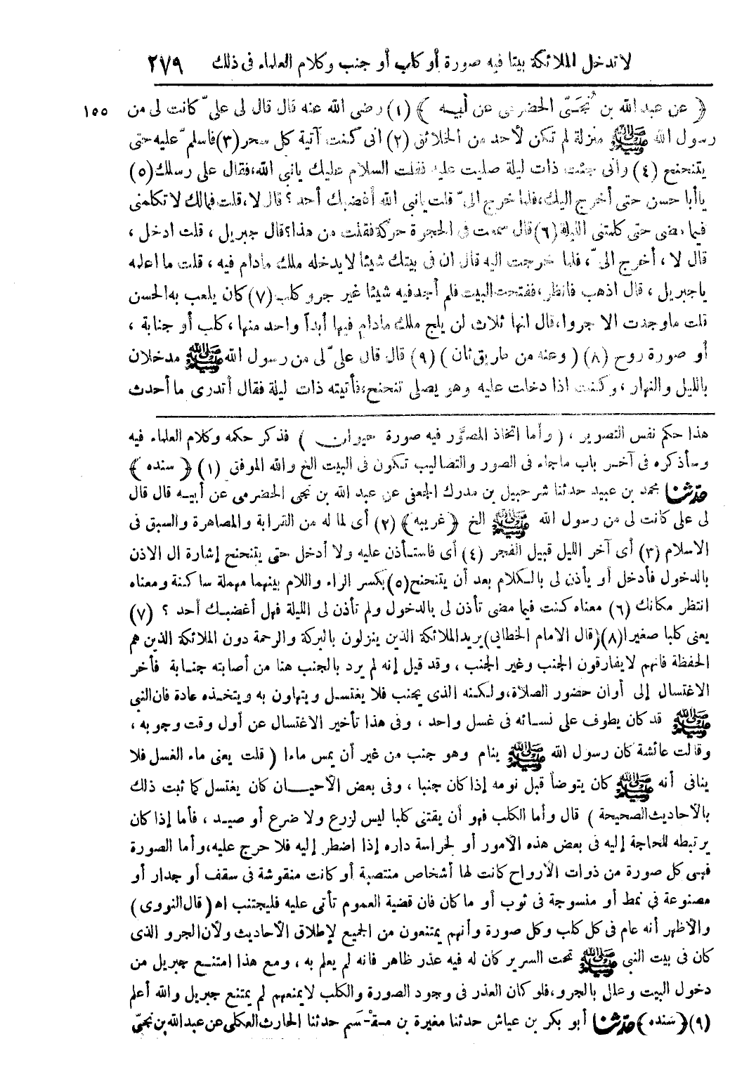 هذا حكم نفس التصوير، (وأما اتخاذ المصوِّر فيه صورة حيوان) فذكر حكمه وكلام العلماء فيه وسأذكره في آخر باب ما جاء في الصور والتصاليب تكون في البيت الخ والله الموفق (1) (سنده) حدّثنا محمد بن عبيد حدثنا شر حبيل بن مدرك الجعفي عن عبد الله بن نجي الحضرمى عن أبيه قال قال لي على كانت لي من رسول الله صلى الله عليه وسلم الخ (غريبه) (2) أي لما له من القرابة والمصاهرة والسبق في الإسلام (3) أي آخر الليل قبيل الفجر (4) أي فستأذن عليه ولا أدخل حتى يتنحنح إشارة إل الإذن بالدخول فأدخل أو يأذن لي بالكلام بعد أن يتنحنح (5) بكسر الراء واللام بينهما مهملة ساكنة ومعناه انتظر مكانك (6) معناه كنت فيما مضى تأذن لي بالدخول ولم تأذن لي الليلة فهل أغضبك أحد؟ (7) يعني كلبا صغيرا (8) (قال الإمام الخطابي) يريد الملائكة الذين ينزلون بالبركة والرحمة دون الملائكة الذين هم الحفظة فانهم لا يفارقون الجنب وغير الجنب، وقد قيل إنه لم يرد بالجنب هنا من أصابته جنابة فأخر الاغتسال إلى أوان حضور الصلاة، ولكنه الذي يجنب فلا يغتسل ويتهاون به ويتخذه عادة فان النبي صلى الله عليه وسلم قد كان يطوف على نسائه في غسل واحد، وفي هذا تأخير الاغتسال عن أول وقت وجوبه، وقالت عائشة كان رسول الله صلى الله عليه وسلم ينام وهو جنب من غير أن يمس ماءا (قلت يعني ماء الغسل فلا ينافى أنه صلى الله عليه وسلم كان يتوضأ قبل نومه إذا كان جنبا، وفي بعض الأحيان كان يغتسل كم ثبت ذلك بالأحاديث الصحيحة) قال وأما الكلب فهو أن يقتني كلبا ليس لزرع ولا ضرع أو صيد، فأما إذا كان يرتبطه للحاجة إليه في بعض هذه الأمور أو لحراسة داره إذا اضطر إليه فلا حرج عليه، وأما الصورة فهي كل صورة من ذوات الأرواح كانت لها أشخاص منتصبة أو كانت منقوشة في سقف أو جدار أو مصنوعة في نمط أو منسوجة في ثوب أو ما كان فان قضية العموم تأتي عليه فليجتنب اه (قال النووي) والأظهر أنه عام في كل كلب وكل صورة وأنهم يمتنعون من الجميع لإطلاق الأحاديث ولأن الجرو الذي كان في بيت النبي صلى الله عليه وسلم تحت السرير كان له فيه عذر ظاهر فانه لم يعلم به، ومع هذا امتنع جبريل من دخول البيت وعلل بالجرو، فلو كان العذر في وجود الصورة والكلب لا يمنعهم لم يمتنع جبريل والله أعلم (9) (سنده) حدّثنا أبو بكر بن عياش حدثنا مغيرة بن مقتسم حدثنا الحارث العكلي عن عبد الله بن نجي