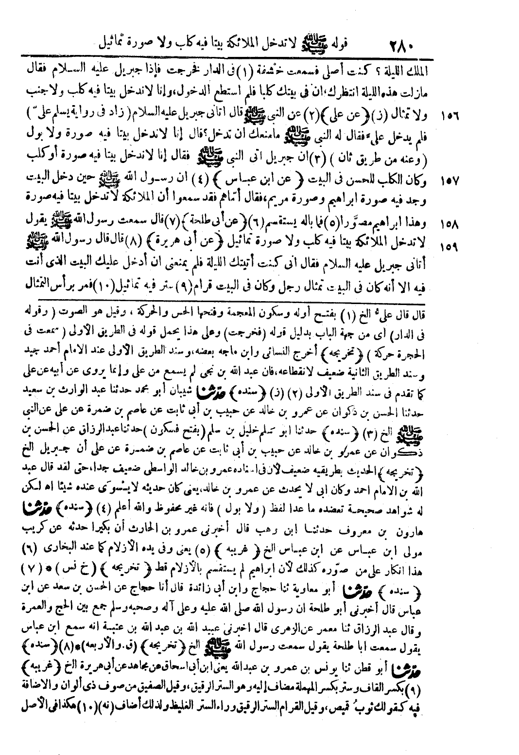 قال قال علىُّ الخ (1) بفتح أوله وسكون المعجمة وفتحها الحس والحركة، وقيل هو الصوت (وقوله في الدار) أي من جهة الباب بدليل قوله (فخرجت) وعلى هذا يحمل قوله في الطريق الأولى (سمعت في الحجرة حركة) (تخريجه) أخرج النسائي وابن ماجة بعضه، وسند الطريق الأولى عند الإمام أحمد جيد وسند الطريق الثانية ضعيف لانقطاعه، فان عبد الله بن نجى لم يسمع من على وإنما يروى عن أبيه عن على كما تقدم في سند الطريق الأولى (2) (ز) (سنده) حدّثنا شيبان أبو محمد حدثنا عبد الوارث بن سعيد حدثنا الحسن بن ذكوان عن عمرو بن خالد عن حبيب بن أبي ثابت عن عاصم بن ضمرة عن على عن النبي صلى الله عليه وسلم الخ (3) (ٍنده) حدثنا أبو سلم خليل بن سلم (بفتح فسكون) حدثنا عبد الرزاق عن الحسن بن ذكوان عن عمرو بن خالد عن حبيب بن أبي ثابت عن عاصم بن ضمرة عن على أن جبريل الخ (تخريجه) الحديث بطريقيه ضعيف لأر في إسناده عمرو بن خالد الواسطى ضعيف جدا، حتى لقد قال عبد الله بن الإمام أحمد وكان أبي لا يحدث عن عمرو بن خالد، يعني كان حديثه لا يسوى عنده شيئا اهـ لكن له شواهد صحيحة تعضده ما عدا لفظ (ولا بول) فانه غير محفوظ والله أعلم (4) (سنده) حدّثنا هارون بن معروف حدثنا ابن وهب قال أخبرني عمرو بن الحارث أن بكيرا حدثه عن كريب مولى ابن عباس عن ابن عباس الخ (غريبه) (5) يعني وفي يده الأزلام كما عند البخاري (6) هذا إنكار على من صّوره كذلك لأن إبراهيم لم يستقسم بالأزلام قط (تخريجه) (خ نس) * (7) (ٍنده) حدّثنا أبو معاوية ثنا حجاج وابن أبي زائدة قال أنا حجاج عن الحسن بن سعد عن ابن عباس قال أخبرني أبو طلحة أن رسول الله صلى الله عليه وعلى أله وصحبه وسلم جمع بين الحج والعمرة وقال عبد الرزاق ثنا معمر عن الزهري قال اخبرني عبيد الله بن عبد الله بن عتبة أنه سمع ابن عباس يقول سمعت أبا طلحة يقول سمعت رسول الله صلى الله عليه وسلم الخ (تخريجه) (ق. والأربعة) * (8) (ٍنده) حدّثنا أبو قطن ثنا يونس بن عمرو بن عبد الله يعني ابن أبي إسحاق عن مجاهد عن أبي هريرة الخ (غريبه) (9) بكسر القاف وستر بكسر المهملة مضاف إليه وهو الستر الرقيق، وقيل الصفيق من صوف ذي ألوان والإضافة فيه كقولك ثوب قميص، وقيل القرام الستر الرقيق وراء الستر الغليظ ولذلك أضاف (نه) (10) هكذا في الأصل