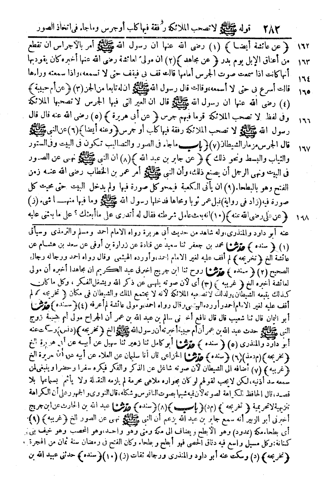 عنه أبو داود والمنذرى، وله شاهد من حديث أبى هريرة رواه الامام أحمد ومسلم والترمذى وسيأتى (1) (سنده) حدّثنا محمد بن جعفر ثنا سعيد عن قتادة عن زرارة بن أوفى عن سعد بن هشام عن عائشة الخ (تخريجه) لم أقف عليه لغير الامام احمد، وأورده الهيثمى وقال رواه احمد ورجاله رجال الصحيح (2) (سنده) حدّثنا روح ثنا ابن جريج اخبرنى عبد الكريم ان مجاهدا أخبره أن مولى لعائشة أخبره الخ (غريبه) (3) أى لأن صوته يلهى عن ذكر الله ويشغل الفكر، وكل ما كان كذلك يتبعه الشيطان، ولذلك لا تصحبه الملائكة لأنه لا يجتمع الملك والشيطان فى مكان (تخريجه) لم أقف عليه الامام أحمد وأورده الهيثمى وقال رواه احمد، ومولى عائشة لم أعرفه (4) (سنده) حدّثنا أبو اليمان قال ثنا شعيب قال قال نافع أخبرنى سالم بن عبد الله بن عمر أن الجراح مولى أم حبيبة زوج النبى صلى الله عليه وسلم حدث عبد الله بن عمر أن أم حبيبة أخبرته أن رسول الله صلى الله عليه وسلم الخ (تخريجه) (دنس) وسكت عنه أبو داود والمنذرى (5) (سنده) حدّثنا أبو كامل ثنا زهير ثنا سهيل عن أبيه عن أبى هريرة الخ (تخريجه) (م دمذ) (6) (سنده) حدّثنا الخزاعى قال أنا سليمان عن العلاء عن أبيه عن أبى هريرة الخ (غريبه) (7) أضافه الى الشيطان لأن صوته شاغل عن الذكر والفكر فيكره سفرا وحضرا وينبغى لمن سمعه سد أذنيه، لكن لا يجب لقولهم لو كان بجواره ملاهى محرمة لم يلزمه النقلة ولا يأثم بسماعها بلا قصد، قال الحافظ الكراهة لصوته لأن فيه شبها بصوت الناقوس وشكله، قال النووى والجمهور على أن الكراهة تنزيهية لا تحريمية (تخريجه) (م د) (باب) (8) (سنده) حدّثنا عبد الله بن الحارث عن ابن جريج أخبرنى أبو الزبير أنه سمع جابر بن عبد الله يزعم أن النبى صلى الله عليه وسلم حدّثنا نهى عن الصور الخ (غريبه) (9) أى بطحاء مكة (ممدود) وهو الأبطح ويضاف الى مكة ومنى وهو واحد، وهو المحصب وهو خيف بنى كنانة: وكل مسيل واسع فيه دقاق الحصى فهو أبطح وبطحاء وكان الفتح فى رمضان سنة ثمان من الهجرة (تخريجه) (د) وسكت عنه أبو داود والمنذرى ورجاله ثقات (ز) (10) (سنده) حدثنى عبيد الله بن