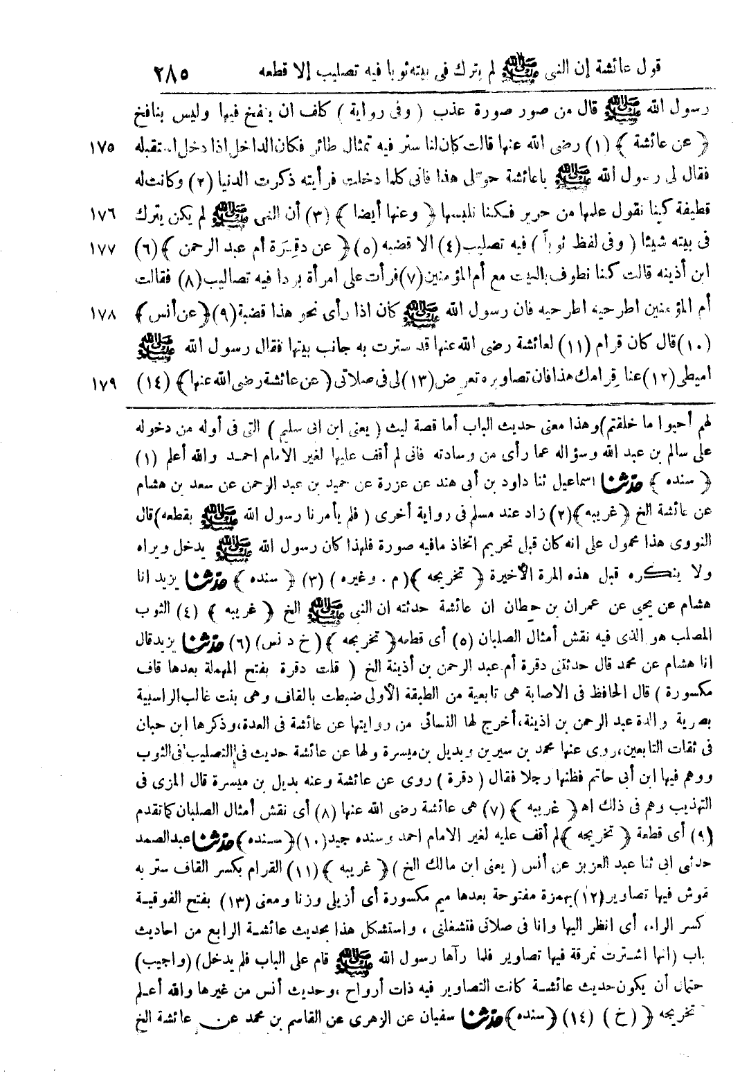 رسول الله صلى الله عليه وسلم قال من صور صورة عذب (وفى رواية) كلف ان ينفخ فيها وليس بنافخ (عن عائشة) (1) رضى الله عنها قالت كان لنا ستر فيه تمثال طائر فكان الداخل اذا دخل استقبله فقال لى رسول الله صلى الله عليه وسلم يا عائشة حوّلى هذا فانى كلما دخلت فرأيته ذكرت الدنيا (2) وكانت له قطيفة كنا نقول عليها من حرير فكنا نلبسها (وعنها أيضا) (3) أن النبى صلى الله عليه وسلم لم يكن يترك فى بيته شيئا (وفى لفظ ثوبًا) فيه تصليب (4) الا قضيه (5) (عن دقرة أم عبد الرحمن) (6) ابن أذينه قالت كنا نطوف بالبيت مع أم المؤمنين (7) فرأت على امرأة بردا فيه تصاليب (8) فقالت أم المؤمنين اطرحيه اطرحيه فان رسول الله صلى الله عليه وسلم كان اذا رأى نحو هذا قضبة (9) (عن أنس) (10) قال كان قرم (11) لعائشة رضى الله عنها قد سترت به جانب بيتها فقال رسول الله صلى الله عليه وسلم اميطى (12) عنا قرامك هذا فان تصاوبره تعرض (13) لى فى صلاتى (عن عائشة رضي الله عنها) (14)