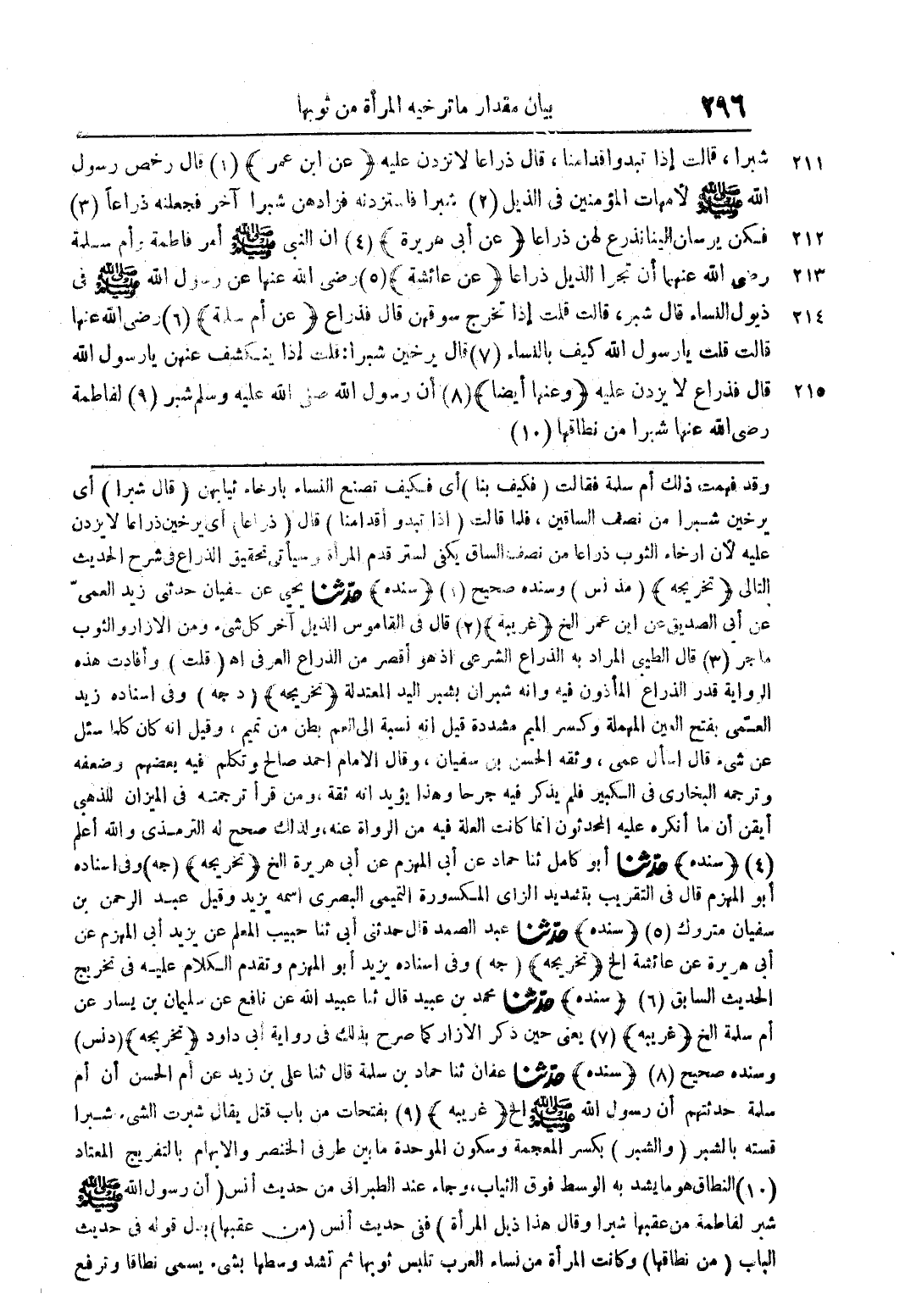 شبرا، قالت إذا تبدو اقدامنا، قال ذراعا لا تزدن عليه (عن ابن عمر) (1) قال رخص رسول الله صلى الله عليه وسلم لأمهات المؤمنين فى الذيل (2) شبرا فاستزدنه فزادهن شبرا آخر فجعلته ذراعًا (3) فكن يرسان الينا تذرع لهن ذراعا (عن أبى هريرة) (4) ان النبى صلى الله عليه وسلم أمر فاطمة وأم سلمة رضى الله عنهما أن تجرا الذيل ذراعا (عن عائشة) (5) رضى الله عنها عن رسول الله صلى الله عليه وسلم فى ذيول النساء قال شمر، قالت قلت إذا تخرج سوقهن قال فذراع (عن أم سلمة) (6) رضى الله عنها قالت قلت يارسول الله كيف بالنساء (7) قال يرخين شبرا: فلينت إذا ينكشف عنهن يا رسول الله قال فذراع لا يزدان عليه (وعنها أيضا) (8) أن رسول الله صلى الله عليه وسلم شبر (9) لفاطمة رضى الله عنها شبرا من نطاقها (10)