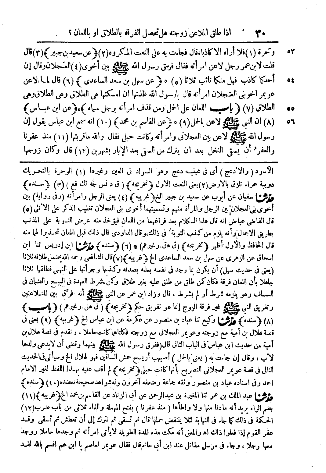 الأسود (والأدعج) اى فى عينية دعج وهو السواد فى العين وغيرها (1) الوحرة بالتحريك دويية حمراء تلتزق بالارض (2) يعنى النعت الاول (تريجةت (ق د نس جة لك فع) (3) (سندة) حدثنا سفيان عن ايوب عن سعيد عن جبير الخ (غريبة) (4) يعنى الرجل وامراتة (وفى رواية) بين اوى بنى العجلان بين الرجل والمراه منهم وتسميتهما اوى بنى العجلان تغليب الذكر على الانثى (5) قال القاضى عياض انة قال هذا الكلام بعد فراغهما من العان فيوخذ منهم عرض التوبة على المذنب بطريق الاجمال وانة يلزم من كذب التوبة لذلك وقال الداودى قال ذلك قبل اللعان تحزيرا لهما منة قال الحافظ الاول اظهر (تخريجة) (ق هق. وغيرهم) (6) (سندة) حدثنا ابن ادريس ثنا ابن اسحاق عن الزهرى عن سها بن سعد الساعدى الخ غريبة (7) قال الشافعى رحمة اللة يحتمل طلاقة ثلاثا (يعنى فى حدحيث سهل) ان يكون بما وجدفى نفسة بعلمة بصدقة وكذبها وجراتها على النبى فطلقها ثلاثا جاهلا بان اللعان فرقة فكان كمن طلق منطلق علية بغير طلاق وكمن شرط العهدة فى البيع والضمان فى السلف وهو يلزمة شرط او لم يشرط قال وزاد ابن عمر عن النبى صلى اللة علية وسلم انة فرق بين الملاعنين وتفريق النبى صلى اللة علية وسلم غير فرقة الزوج انما هو تفريق حكم (تريجة) (ق هق. وغيرهم) (باب) (8) (سندة) حدثنا وكيع ثنا عباد بن منصور عن عكرمة عن ابن عباس الخ (غريبة) (9) يعنى فى قصة هلال بن اكية مع زوجتة وعويمر العجلانى مع زوجتة فكلتاهما كانت حاملا وتقدم فى قصة هلال بن امية من حديث ابن عباس فى الباب الثانى قال (ففرق رسول اللة صلى اللة علية وسلم بينهما وقضى ان لا يدعى ولدها لاب وقال ان جاءت بة (يعنى بالحمل) اصيهب اريسح حمش الساقين هو لهلال الخ وسياتى فى الحديث التالى فى قصة عويمر العجلانى التصريح بانها كانت حبلى (تريجة) لم اقف علية بهذا اللفظ لغير الامام احمد وفى اسنادة عباد بن منصور وثقة جماعة وضعفة ارون ولة شواهد صحيحة تعضدة (10) (سندة) حدثنا عبد الملك بن عمر ثنا المغيرة بن عبد الرحمن عن ابى الزناد عن القاسم بن محمد ال (غريبة) (11) بضم الراء يريد انة مادنا منها ولا واطاها (منذ عفرنا) بفتح المهملة والفاء ثلاثى من باب ضرب (12) الحكمة فى ذلك كما جاء فى النهاية لئلا ينتقض حملها قال ثم تسقى ثم تترك الى ان تعطش ثم تسقى وقد عفر القوم اذا فعلوا ذلك اه والمعنى انة مكث هذه المدة لا ياتى امراتة ثم وجدها حاملا ووجد معها رجلا وجاء فى مرسل مقاتل عند ابن ابى حاتم قال فقال عويمر لعاصم يا ابن عم أقسم بالله لقد