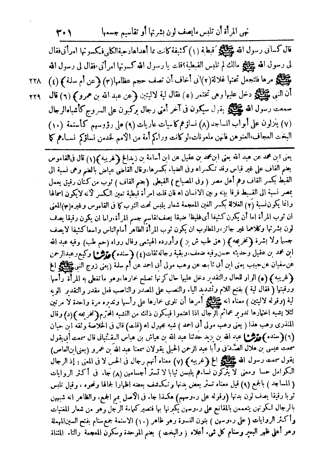 قال كساني رسول الله صلى الله عليه وسلم قبطية (1) كثيفة كانت مما اهداها دحية الكلى فكسوتها امرأتى فقال لى رسول الله صلى الله عليه وسلم مالك لم تلبس القبطية؟ قلت يا رسول الله كسوتها امرأتى، فقال لى رسول الله صلى الله عليه وسلم مرها فلتجعل تحتها غلالة (2) انى أخاف أن تصف حجم عظامها (3) (عن أم سلمة) (4) أن النبى صلى الله عليه وسلم دخل عليها وهى تختمر (5) فقال لية لاليتين (عن عبد الله بن عمرو) (6) قال سمعت رسول الله صلى الله عليه وسلم يقول سيكون فى آخر أمتى رجال يركبون على السروج كأشباه الرجال