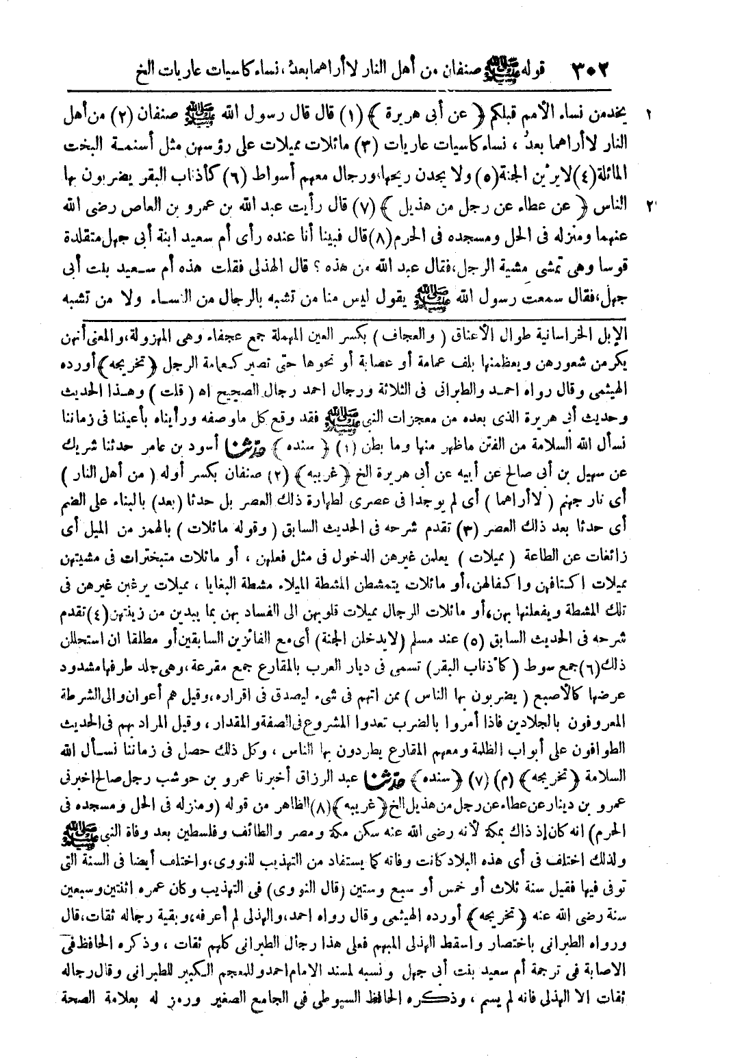 الإبل الخراسانية طوال الأعناق (والعجاف) بكسر العين المهملة جمع عجفاء وهى المهزولة، والمعنى أنهن يكرمن شعورهن ويعظمنها بلف عمامة أو عصابة أو نحوها حتى تصير كعامة الرجل (تخريجه) أورده الهيثمى وقال رواه احمد والطبرانى فى الثلاثة ورجال احمد رجال الصجيح اهـ (قلت) وهذا الحديث وحديث أبى هريرة الذى بعده من معجزات النبى صلى الله عليه وسلم فقد وقع كل ما وصفه ورأيناه بأعيننا فى زماننا نسأل الله السلامة من الفتن ما ظهر منها وما بطن (1) (سنده) حدّثنا أسود بن عامر حدثنا شريك عن سهيل بن أبى صالح عن أبيه عن أبى هريرة الخ (غريبه) (2) صنفان بكسر أوله (من أهل النار) أى نار جهنم (لاأراهما) أى لم يوجدا فى عصرى لطهارة ذلك العصر بل حدثا (بعد) بالبناء على الضم اى حدثا بعد ذلك العصر (3) تقدم شرحه فى الحديث السابق (وقوله مائلات) بالهمز من الميل أى زائغات عن الطاعة (مميلات) يعلمن غيرهن الدخول فى مثل فعلهن، أو مائلات متبخترات فى مشيتهن مميلات اكتافهن واكفالهن، أو مائلات يتمشطن المشطة الميلاء مشطة البغايا، مميلات يرغبن غيرهن فى تلك المشطة ويفعلنها بهن، أو مائلات الرجال مميلات قلوبهن الى الفساد بهن يبدين من زينتهن (4) تقدم شرحه فى الحديث السابق (5) عند مسلم (لا يدخلن الجنة) أى مع الفائزين السابقين أو مطلقا ان استحللن ذلك (6) جمع سوط (كأذناب البقر) تسمى فى ديار العرب بالمقارع جمع مقرعة، وهى جلد طرفها مشدود عرضها كالأصبع (يضربون بها الناس) ممن اتهم فى شئ ليصدق فى اقراره، وقيل هم أعوان والى الشرطة المعروفون بالجلادين فاذا أمروا بالضرب تعدوا المشروع فى الصفة والمقدار، وقيل المراد بهم فى الحديث الطوافون على أبواب الظلمة ومعهم المقارع يطردون بها الناس، وكل ذلك حصل فى زماننا نسأل الله السلامة (تخريجه) (م) (7) (سنده) حدّثنا عبد الرزاق أخبرنا عمرو بن حوشب رجل صالح اخبرنى عمرو بن دينار عن عطاء عن رجل من هذيل الخ (غريبه) (8) الظاهر من قوله (ومنزله فى الحل ومسجده في الحرم) انه كان إذ ذاك بمكة لأنه رضى الله عنه سكن مكة ومصر والطائف وفلسطين بعد وفاة النبى صلى الله عليه وسلم ولذلك اختلف فى أى هذه البلاد كانت وفاته كما يستفاد من التهذيب للنووى، واختلف أيضا فى الستة التى توفى فيها فقيل سنة ثلاث أو خمس أو سبع وستين رقال النووى) فى التهذيب وكان عمره اثنتين وسبعين سنة رضى الله عنه (تخريجه) أورده الهيثمى وقال رواه احمد، والهذلى لم أعرفه، وبقية رجاله ثقات، قالو رواه الطبرانى باختصار واسقط الهذلى المبهم فعلى هذا رجال الطبرانى كلهم ثقات، وذكره الحافظ فى الاصابة فى ترجمة أم سعيد بنت أبى جهل ونسبه لمسند الامام احمد والمعجم الكبير الطبرانى وقال رجاله ثقات الا الهذلى فانه لم يسم، وذكره الحافظ السيوطى فى الجامع الصغير ورمز له بعلامة الصحة