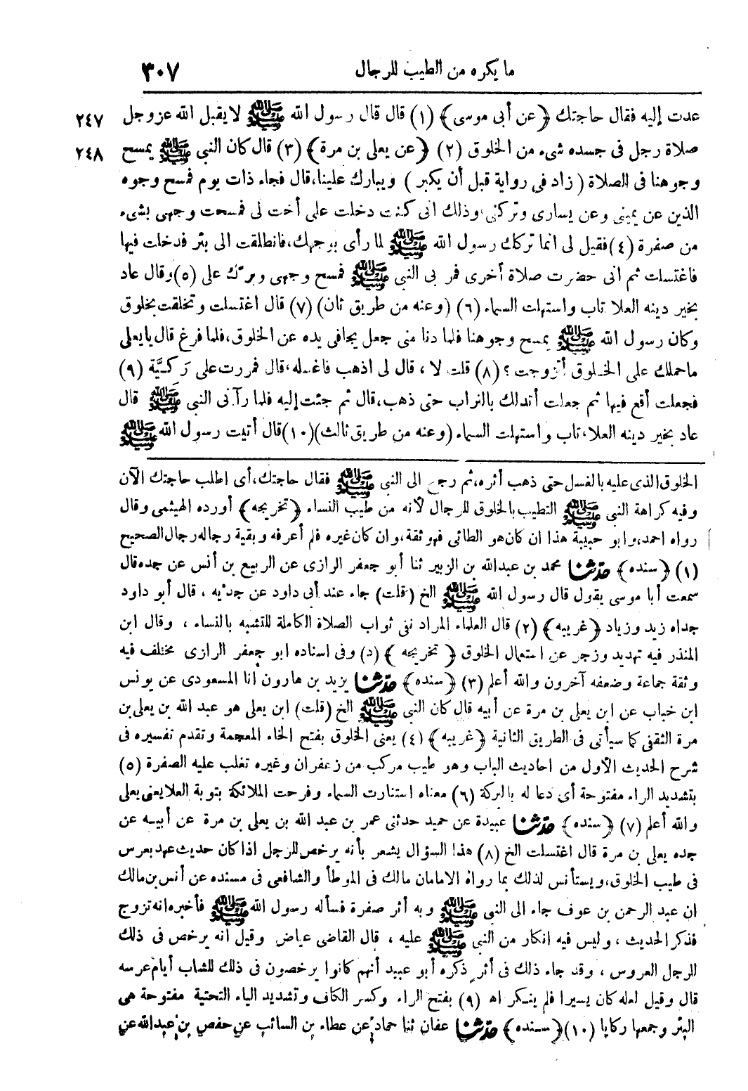 عدت إليه فقال حاجتك (عن أبى موسى) (1) قال قال رسول الله صلى الله عليه وسلم لا يقبل الله عز وجل صلاة رجل فى جسده شئ من الخلوق (2) (عن يعلى بن مرة) (3) قال كان النبى صلى الله عليه وسلم يمسح وجوهنا فى الصلاة (زاد فى رواية قبل أن يكبر) ويبارك علينا، قال فجاء ذات يوم فمسح وجوه الذين عن يمينى وعن يسارى وتركنى، وذلك انى كنت دخلت على أخت لى فمسحت وجهى بشئ من صفرة (4) فقيل لى انما تركك رسول الله صلى الله عليه وسلم لما رأى بوجهك، فانطلقت الى بئر فدخلت فيها فاغتسلت ثم انى حضرت صلاة أخرى فمر بى النبى صلى الله عليه وسلم فمسح وجهى وبرّك على (5) وقال عاد بخير دينه العلا تاب واستهلت السماء (6) (وعنه من طريق ثان) (7) قال اغتسلت وتخلقت بخلوق وكان رسول الله صلى الله عليه وسلم يمسح وجوهنا فلما دنا منى جعل يجافى يده عن الخلوق، فلما فرغ قال يا يعلى ما حملك على الخلوق أتزوجت؟ (8) قلت، لا، قال لى اذهب فاغسله، قال فمررت على ركيَّة (9) فجعلت أقع فيها ثم جعلت أتدلك بالتراب حتى ذهب، قال ثم جئت إليه فلما رآنى النبى صلى الله عليه وسلم قال عاد بخير دينه العلا، تاب واستهلت السماء (وعنه من طريق ثالث) (10) قال أتيت رسول الله صلى الله عليه وسلم